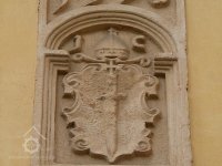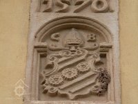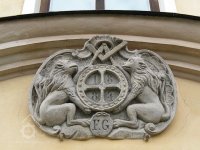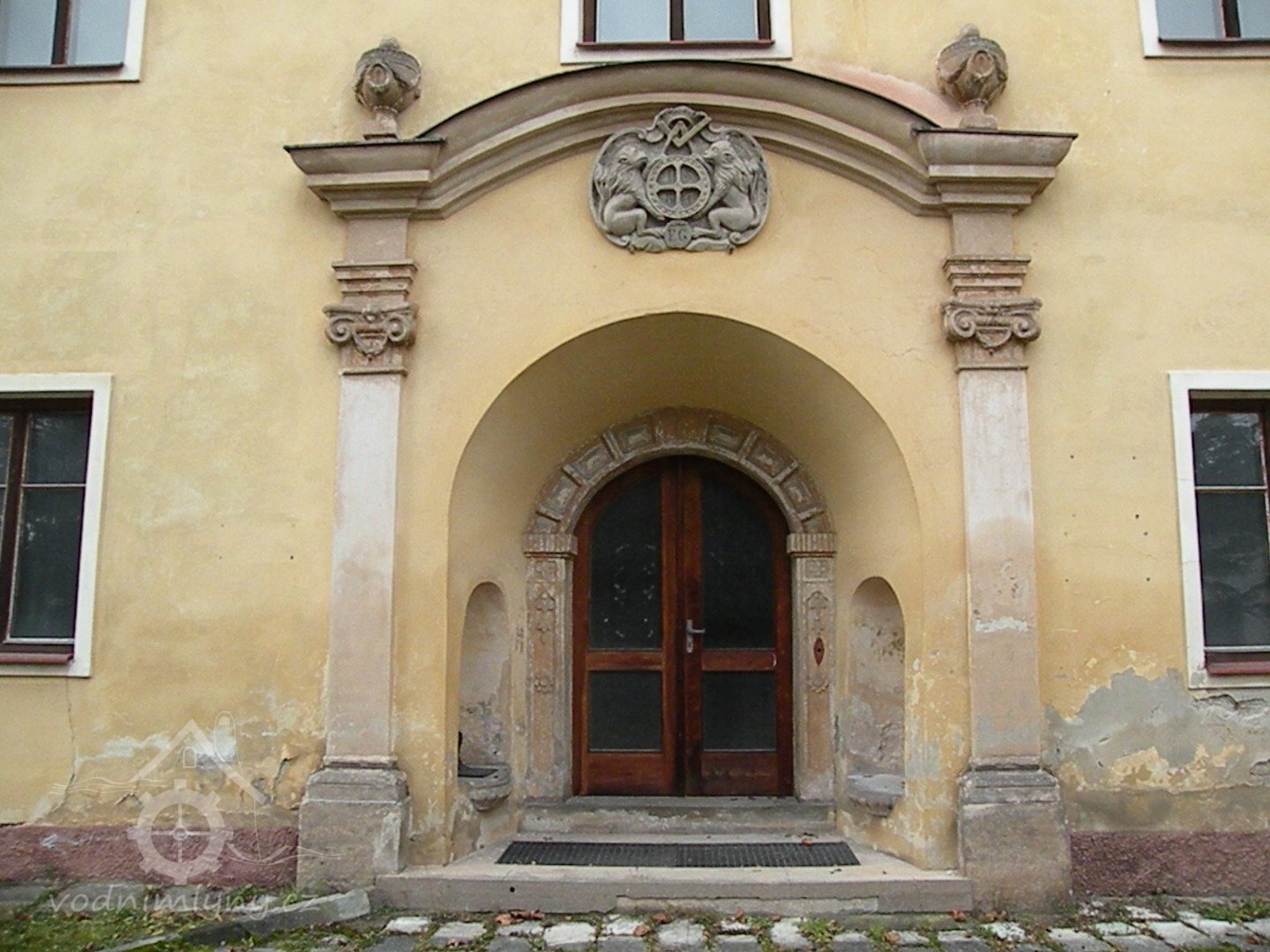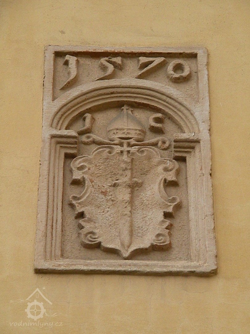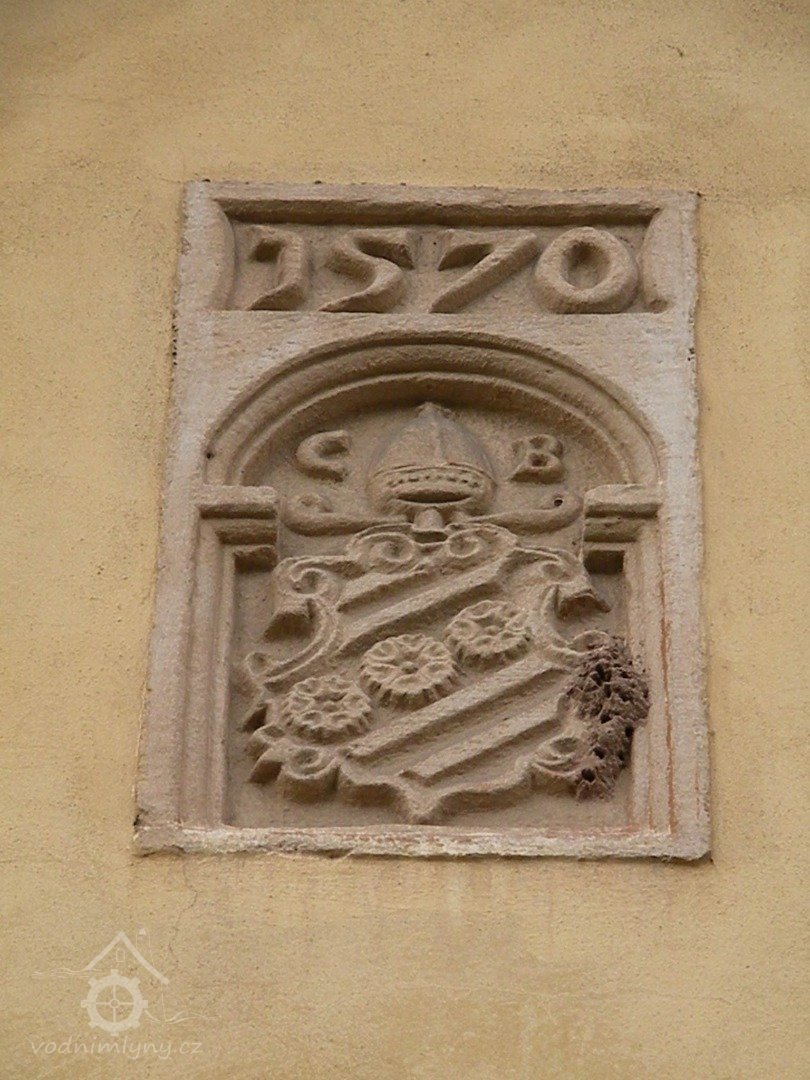 Na fasádě dvě reliéfní desky s letopčtem 1570, jedna s erbem meče a iniciálami JC (=Jan Chotowský), druhá s erbem se třemi růžemi v šikmém břevně (Břevnovsko-broumovské opatství)