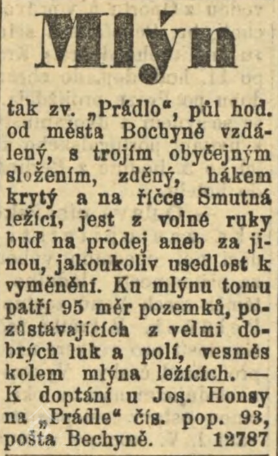 1888 prodej mlýna, majitel Josef Hons. (RR)