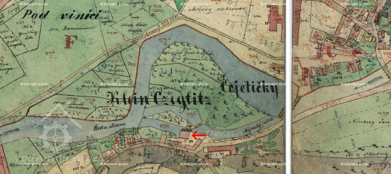 1860: 6 složení v hlavním mlýně, na pravé straně ostrůvku menší mlýn tzv. povodník s 2 českými složeními
