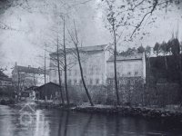 1860 jednopatrová budova krytá šindelem, na pravé straně náhonu menší mlýn - povodník.