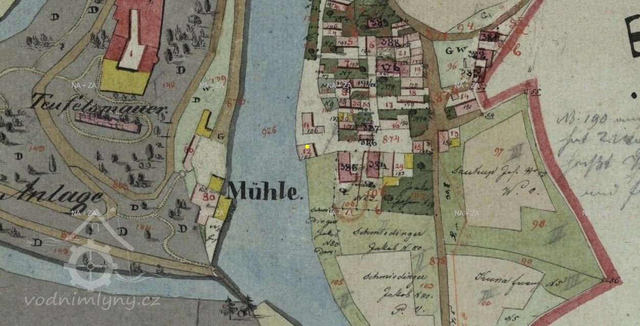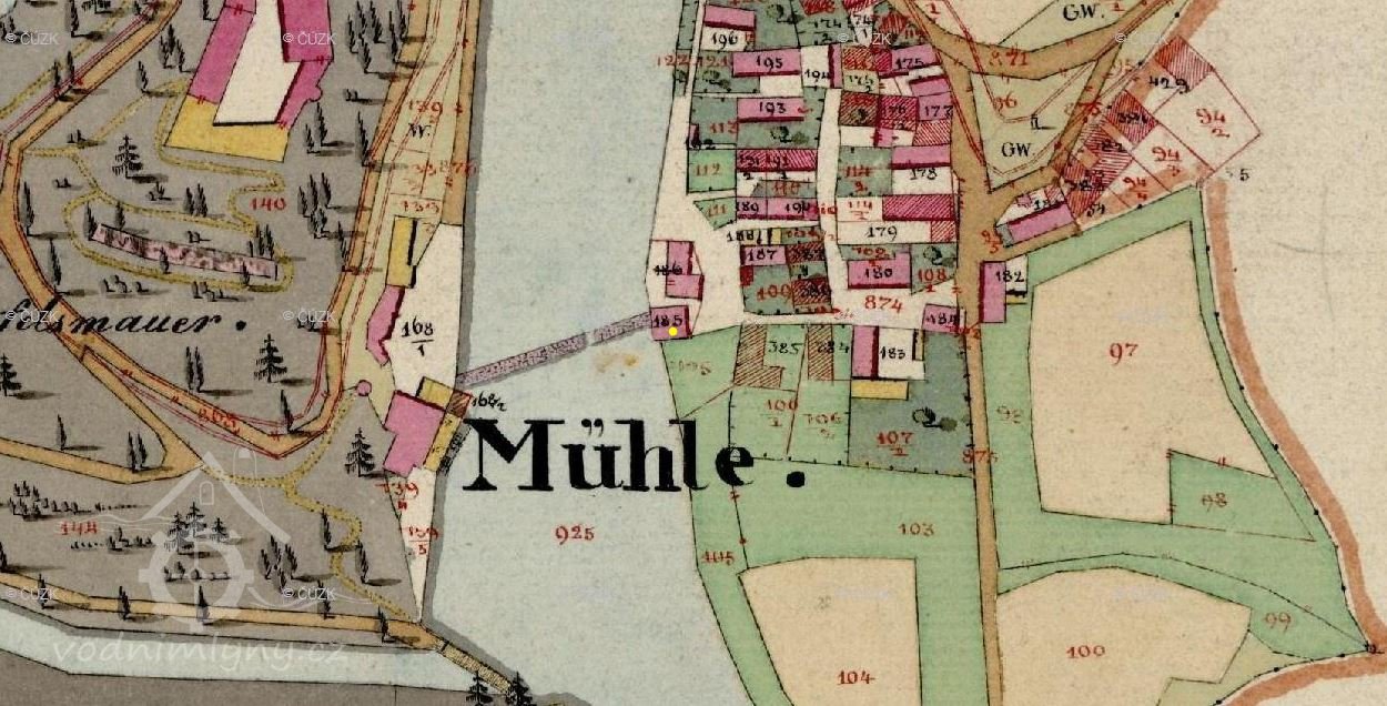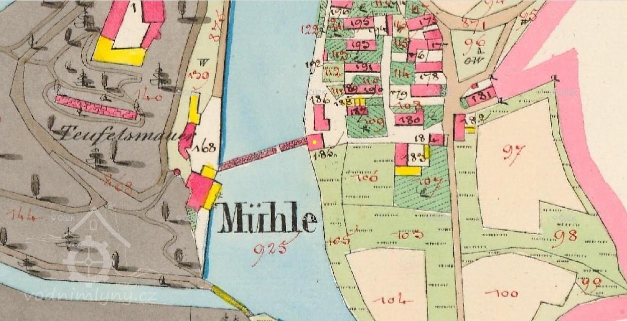 Mlýn vznikl až někdy po roce 1828. Není vyobrazen na historických katastrálních mapách. (RŠ)