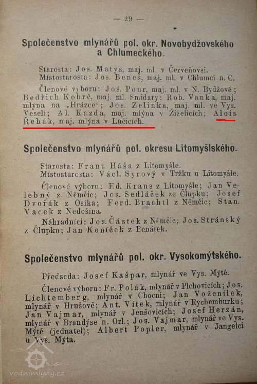 1899 - majitel mlýna Alois Řehák členem výboru Společenstva mlynářů pol okr. Novobydžovského a Chlumeckého (Fr. Duška - Kapesní kalendář mlýnů česko-moravských, r. 1899) (HŠ)