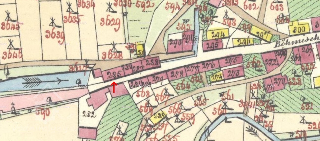 Na místě mapové značky mezi ulicemi 1. máje a Nádražní stál Königův mlýn. Jsou dochované základy místy i přes metr vysoké. Náhon je zasypaný, ale vodu z mlýna odváděl podzemní kanál, který ve sklepech sousedních domů dochovaný je. Kanál vedl vodu k mlýnu Na skále, který stával asi o 70 metrů dál. (RŠ)