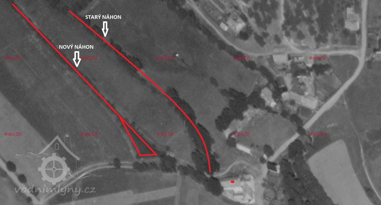 K mlýnu vedl dříve jeden náhon asi 10 m pod tím novým. Vedl po straně nynějších sádek, dříve to byl nejspíše rybník, je tam i hráz. Pak se ale udělal lepší a ten vede více nahoře pro lepší výsledek. Když v tom novém dotekla voda kousek nad mlýn, kde ústí trubka, byl tam malý rybníček.