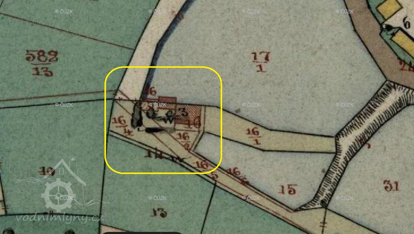 Pokud je místo kde stojí mlýn správně označeno, tak mlýn vznikl až po roce 1842. Je vyobrazen pouze na Indikační skice, ale na Císařském otisku chybí. (RŠ)