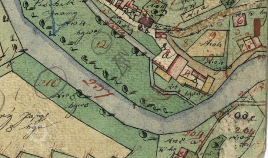 V roce 1930 zde byla dvě kola na spodní vodu, jedno s průtokem 0.311 m3/s a spádem 2.38 m a druhé s průtokem 0.365 m3/s, spádem 2.55 m, s celkovým výkonem 6.65 k.