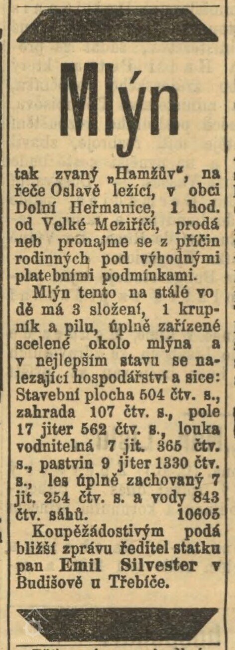 1695 Urbář panství velkomeziříčského: Samuel Hamiša (Hamža), platí 2 zl. 53 kr. na sv. Jiří, 1 zl. 73 kr. na sv. Václava a 15 kr. za ponůcku