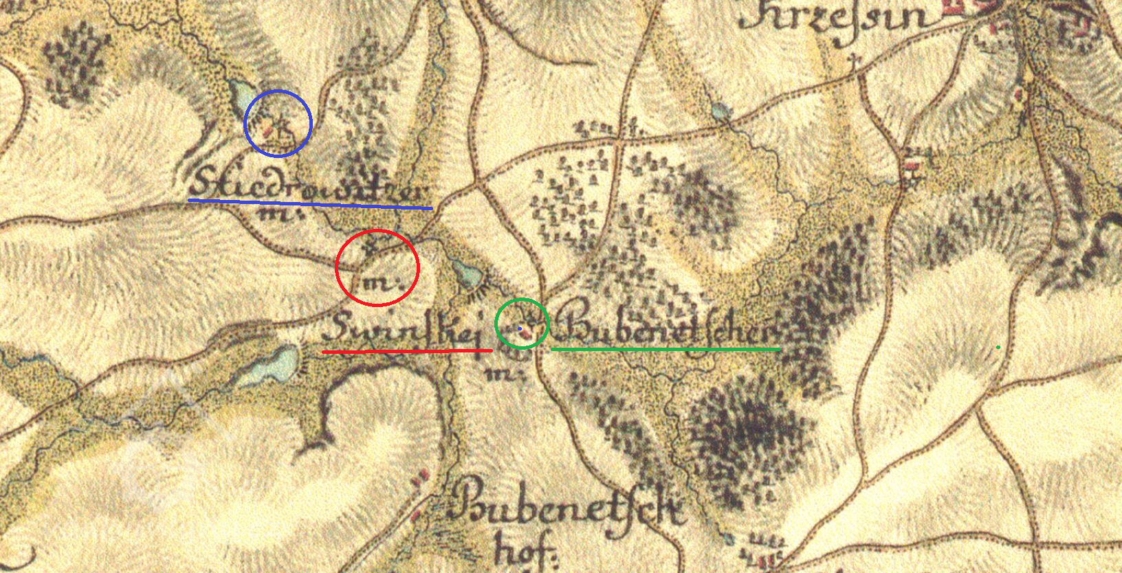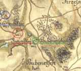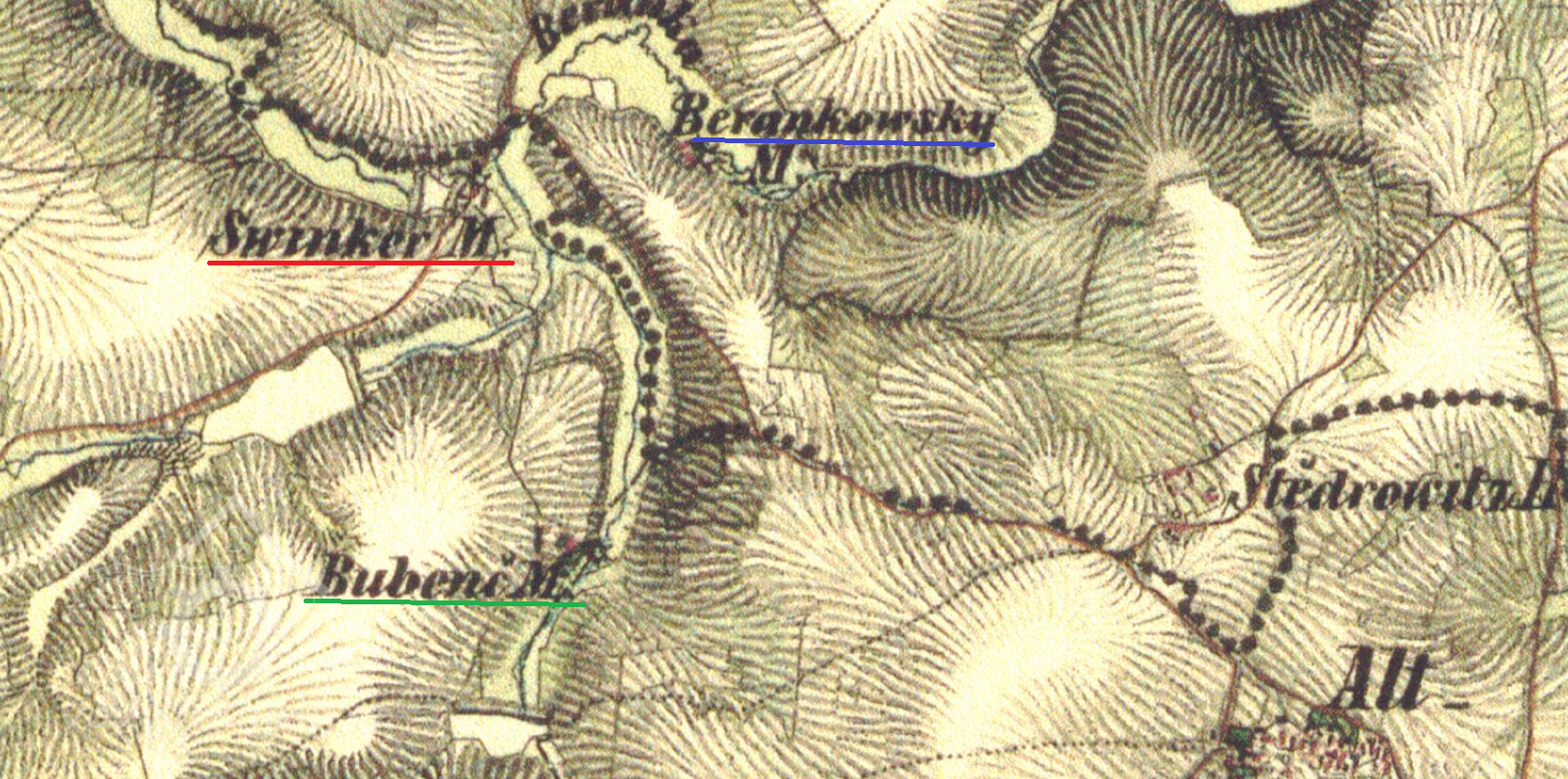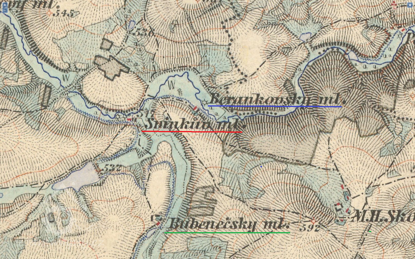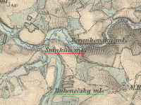 Obilný mlýn je vyobrazen na mapě I. voj. mapování.