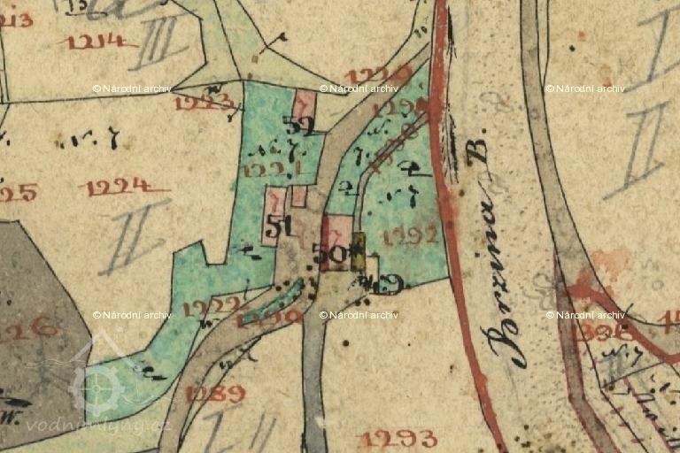 Stále existující 600 m dlouhý náhon, do poslední třetiny 19. stol. od dlouhého kamenného jezu na sz okraji obce Brziny poblíž čp. 85. Na přelomu 19. a 20. stol. zřízena akumulační nádržka a dva rybníčky, dnes zvané Mottl a Paukner. Z náhonu šla voda na dřevěné vantroky a čtyřni žlaby na kola. Odtud voda odtékala v přímém směru zpět do Brziny.