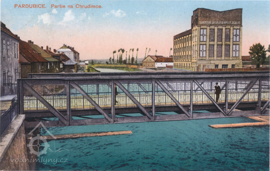 Po regulaci Chrudimky r.1910 postavili bratří Winternitzové r.1911 na pravém břehu moderní – automatické mlýny, mlýny, které nahradily řadu starších pa. mlýnů, z nichž většina zanikla po regulaci Chrudimky. Stavba provedená podle návrhu arch. Gočára je dnes technickou památkou. Nejmodernější strojní zařízení dodala pa. továrna J.Prokopa synové, snad i elektrické zařízení. Po požáru 19.6.1919 mlýn obnoven a dle arch.Gočára přistavěno shodně vysoké obilní silo propojené s mlýnem dopravníkovým mostem na klenutém oblouku. Mlýn byl z počátku poháněn vodní turbínou a o vodu se dělil s hydroelektrárnou u Záhorského jezu. Později přešel na elektrický pohon. Po r.1948 byl mlýn znárodněn a v 60. letech 20.stol. rozšířen severním směrem, opět vybaven nejmodernějším zařízením od n.p. TMS s celoskleněným dopravním potrubím. Tehdy došlo k zásadní urbanistické chybě. Povolením rekonstrukce Pardubice zahodily příležitost umístit nový mlýn do průmyslové oblastí Černá za B., kde měl stát u obilního sila. Následovala výstavba pekáren vedle Na Ležánkách, které měly být také u sila v průmyslové oblasti.