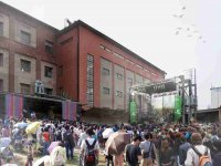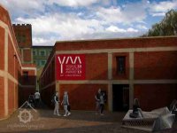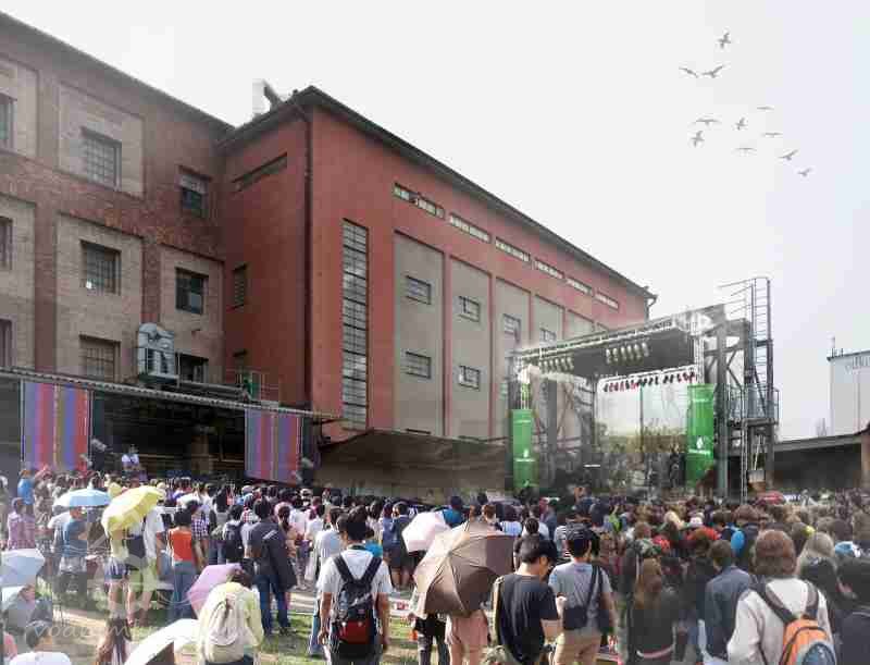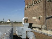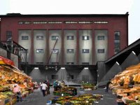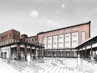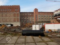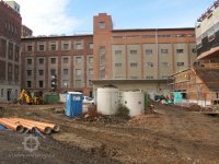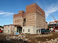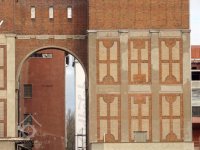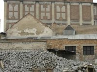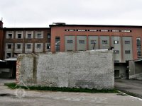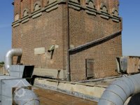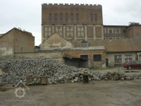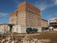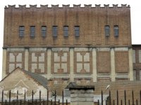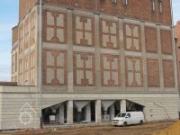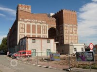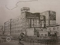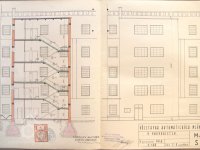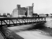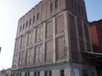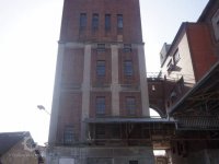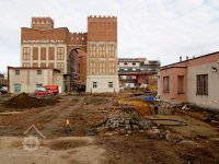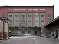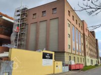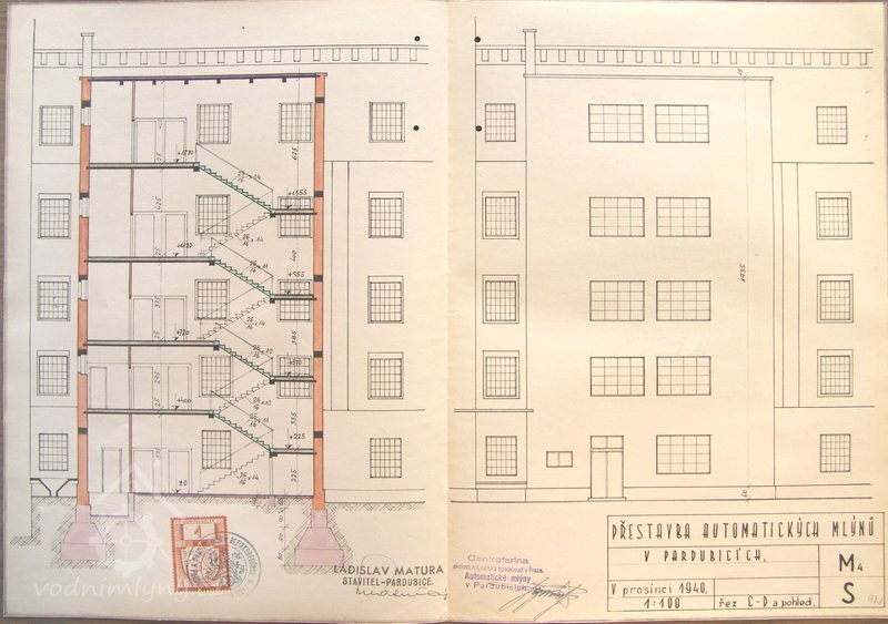 Přístavba moučného sila k severní fasádě historické budovy mlýnů v Pardubicích z let 1959-1961 podle projektu Karla Řepy z roku 1950.