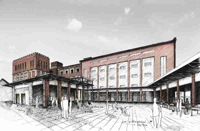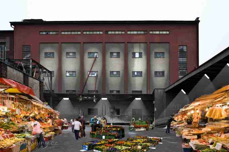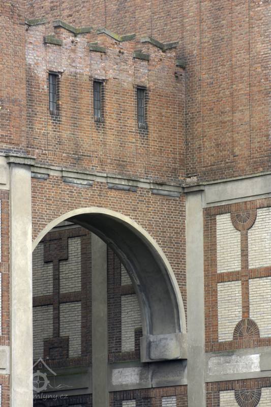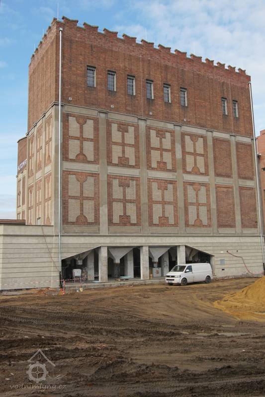 Geniálně řešená kontextuální přístavba moučného sila ke staršímu mlýnu, významná architektura Josefa Gočára.