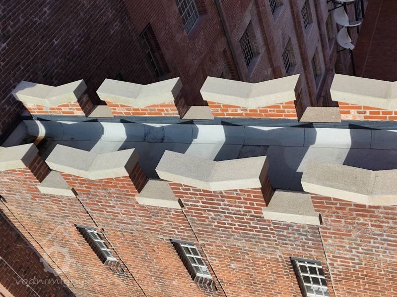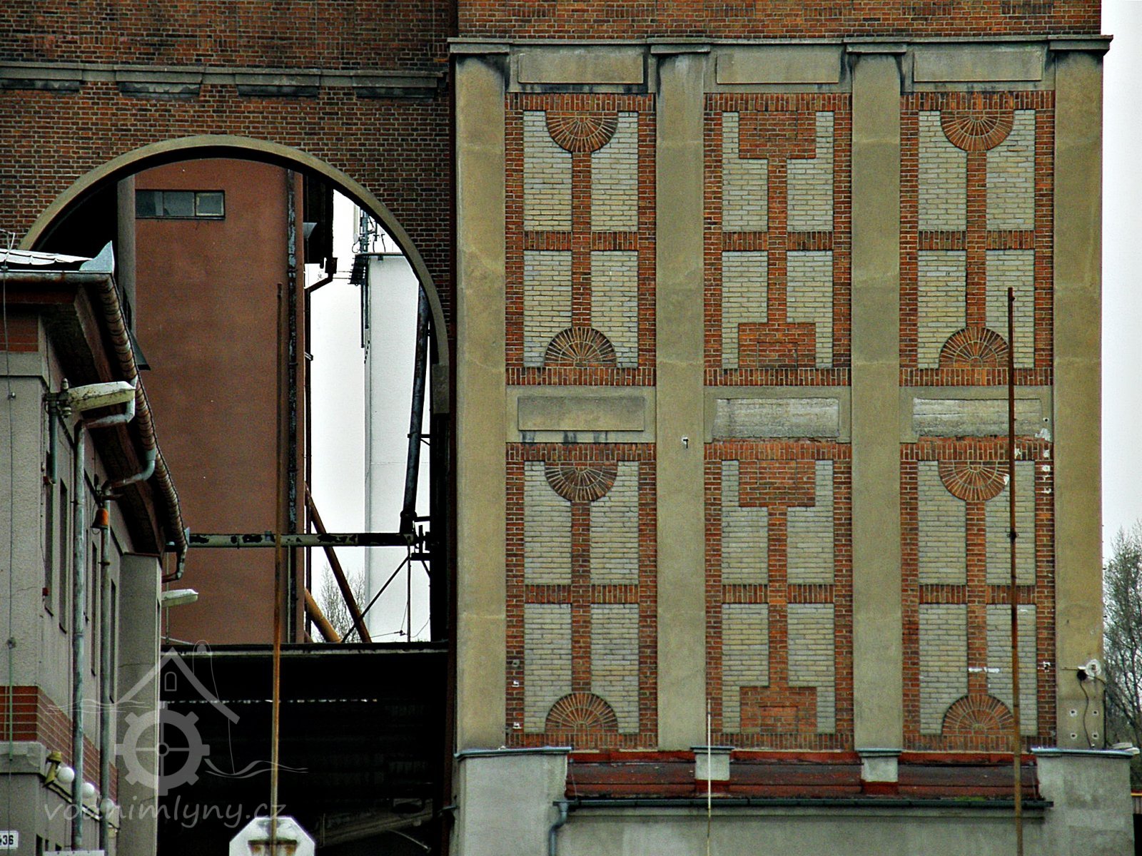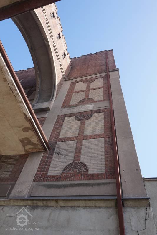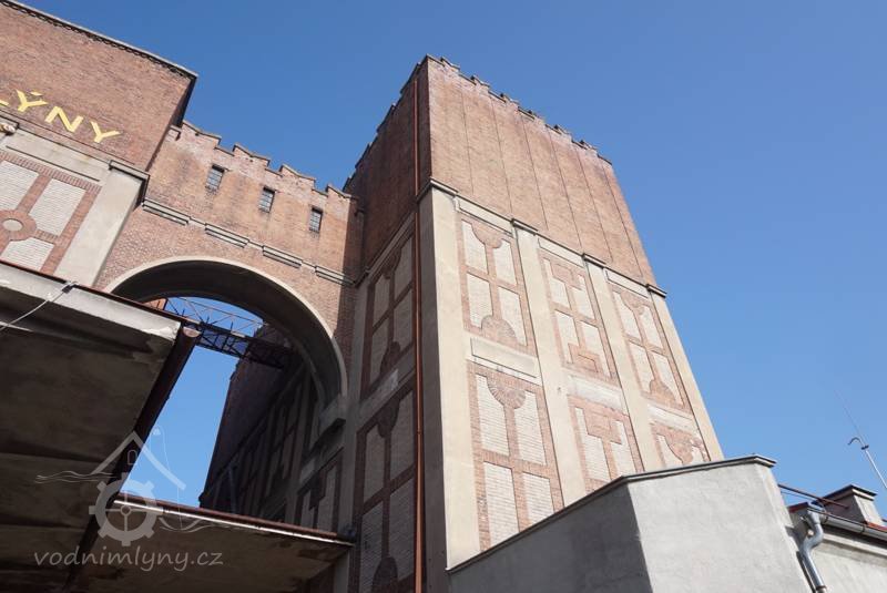 Starší budova mlýna je v úrovni 4. patra za atikou, z traktu čistírny mlýna, spojena úzkou chodbou se samostatně stojící mladší budovou sila pomocí prampouchu s atikou, která se opakuje i v zakončení budovy sila. Účelová zděná chodba výškově obdélného průřezu s rovným zastřešením je vynášena jediným půlkruhově zaklenutým pasem (prampouchem). Osvětlená je z obou boků třemi pravidelně rozmístěnými úzkými okny industriálního typu s kovovými rámy. Pojetí režného cihelného pláště a členění fasády plochými atikovými pilířky zakončenými motivem z vlaštovčích ocasů vychází z jednotné autorské koncepce. pilířky jsou nesené zalamovanou kamennou římsou a ukončené krycími kamennými deskami.