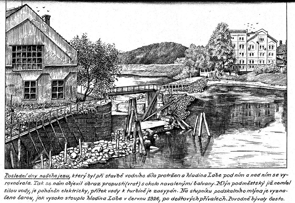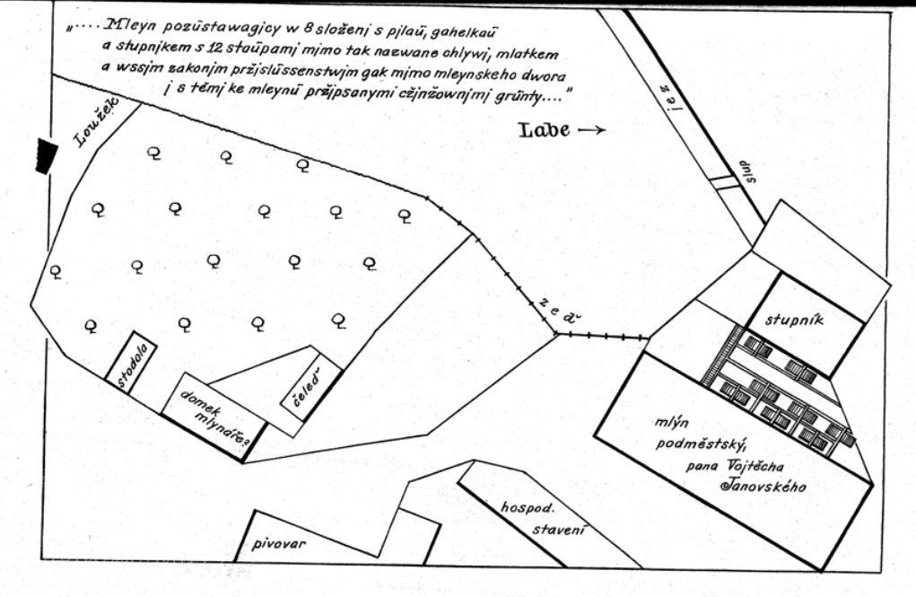 Léta páně 1690 dne 7. septembr za povinnosti primátorské pana Pavla Textora a starších obecních s ním Mikoláše Kůrky a Jana Chalupy v dokonalý ruině jsoucí mlejn obecní a v něm nájemník Frantz Veselý s pomocí Boží k napravení dokonalému jest přiveden, kdežto zeď okolo Labe 30 sáhů dýlky a vejšky nová na spáru udělaná k starý spojená od mistra zednického Matěje Semotan z Kutný Hory, pod dní dvě podvaly dubový zaberaněný místo gruntů jsou dány, stropy oba dva jak ve světnici tak ve mlejnici vnově udělaný a vymazaný, kryt nad celým mlejnem nový dobře přikrytý a mnohem skromnější nežli starý byl vyzdvižený. Též vazba nová u vody, na který trámy ležejí udělaná a všecko to dílo s pomocí Boží dokončeno jest léta 1692 dne 2. julii. Nákladu na to vzešlo 138 kop 3 gr. 2 den.