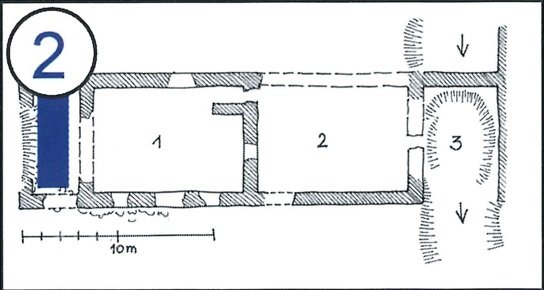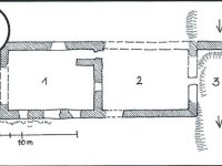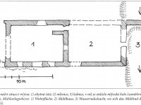 Obytná mlýnice 26 x 7 m, z mlýnice dochováno pouze základové zdivo, obytná část zachována lépe.