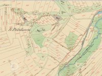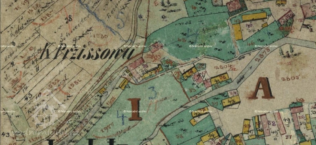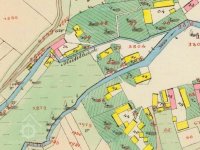 1) obytné stavení s mlýnicí 2) náhon 3) stodola 4) bývalé chlévy