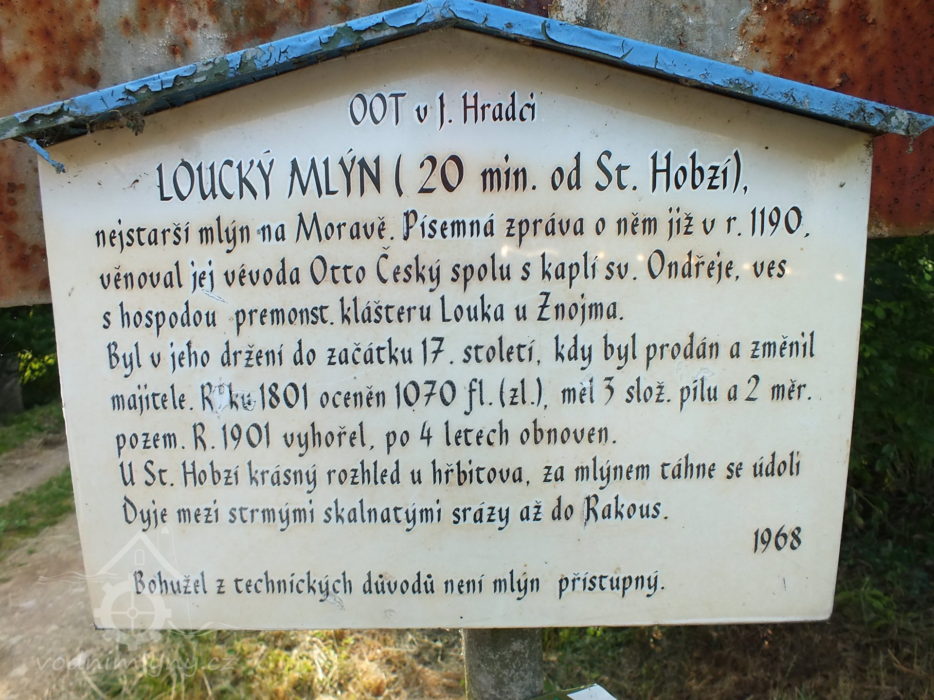 Areál bývalého mlýna s náhonem a splavem se nalézá ne levém břehu řeky Dyje, při cestě ze Starého Hobzí do Slavonic. Původ je doložitelný už do 12. století. Současná budova mlýna, respektive mlýnice je stavbou klasicistní.
