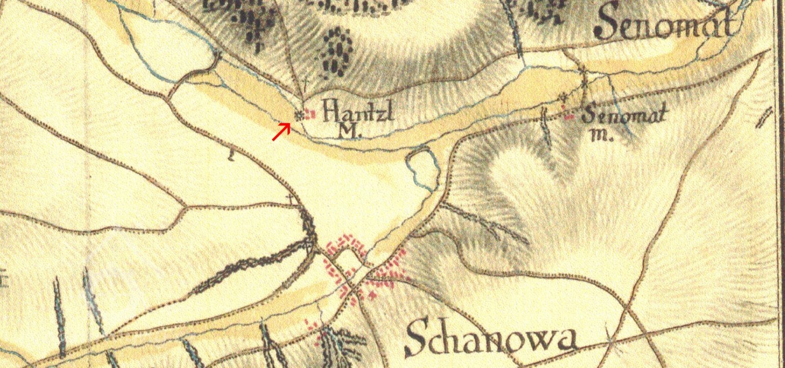 Mlýn se nacházel na samotě u potoka, asi 930 m SZ od centra obce Šanov.
