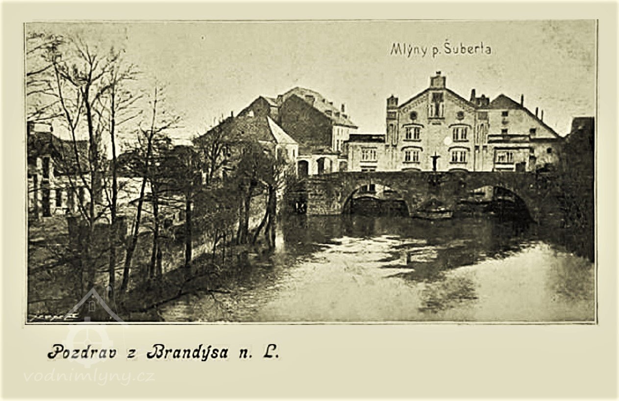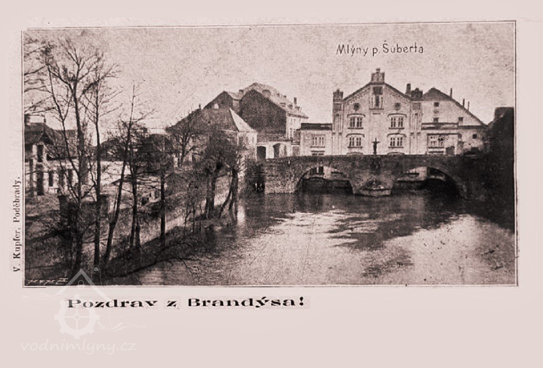 Mlýn na levém břehu Labe byl připomínán už v 11. stol., v roce 1603 byl po povodni obnoven mlynářem Houserem. Ve válce se Švédy byl poškozen a v roce 1648 opět opraven. Na plánu dvorního stavitele J. H. Dinnebiera z roku 1731 je zachycen jako budova s mlýnicí zaklenutou šesti poli křížových kleneb na střední pilíře. Náhony měl po obou stranách, s deseti koly umístěnými ve dvou řadách po pěti na každé straně. Poháněly devět mlýnských složení a jednu stoupu. Od roku 1880 patřil Bedřichu Schubertovi, jehož rodina mlýn opravila, rozšířila a roku 1933 zmodernizovala. Současná podoba pochází z celkové přestavby z roku 1860. Budova má bazilikální uspořádání hmot, střední část s nízkým štítem s obloučkovým podřímsím, krajní trakty mají jen zvýšená přízemí. Střecha je mansardová, fasády historizující, s prvky neorománského a neogotického slohu, členěné vysokým řádem sdružených lizén. Segmentově zaklenutá sdružená okna s nadokenními římsami podtrhují industriální ráz architektury. V srpnu 1948 byl mlýn znárodněn a připojen k firmě Odkolek se sídlem v Praze, od roku 1990 pracoval jako mísírna pekařských a cukrářských směsí.