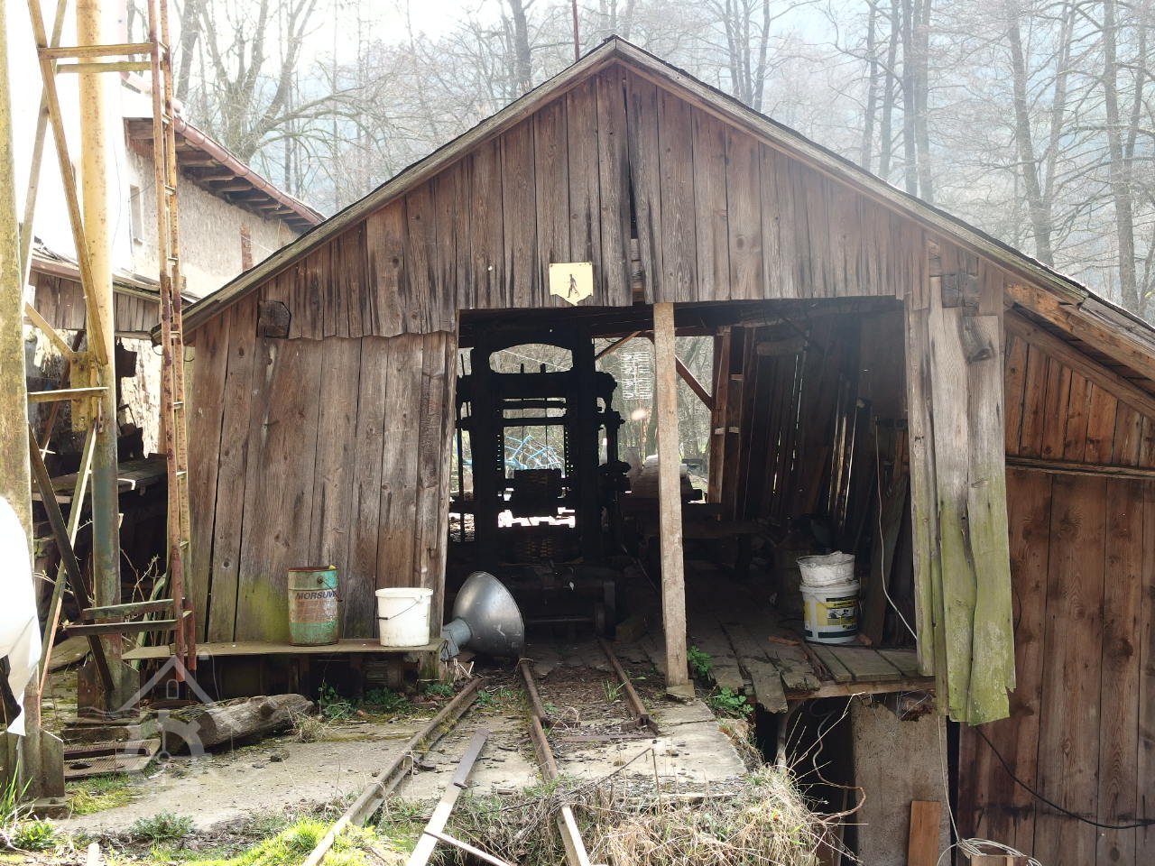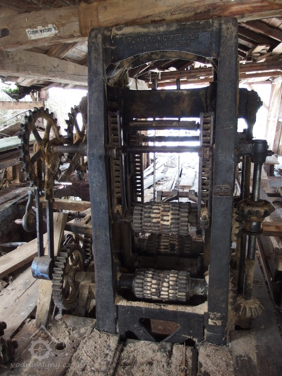 Pila tvoří samostatnou dřevěnou přístavbu na zadní straně mlýna.