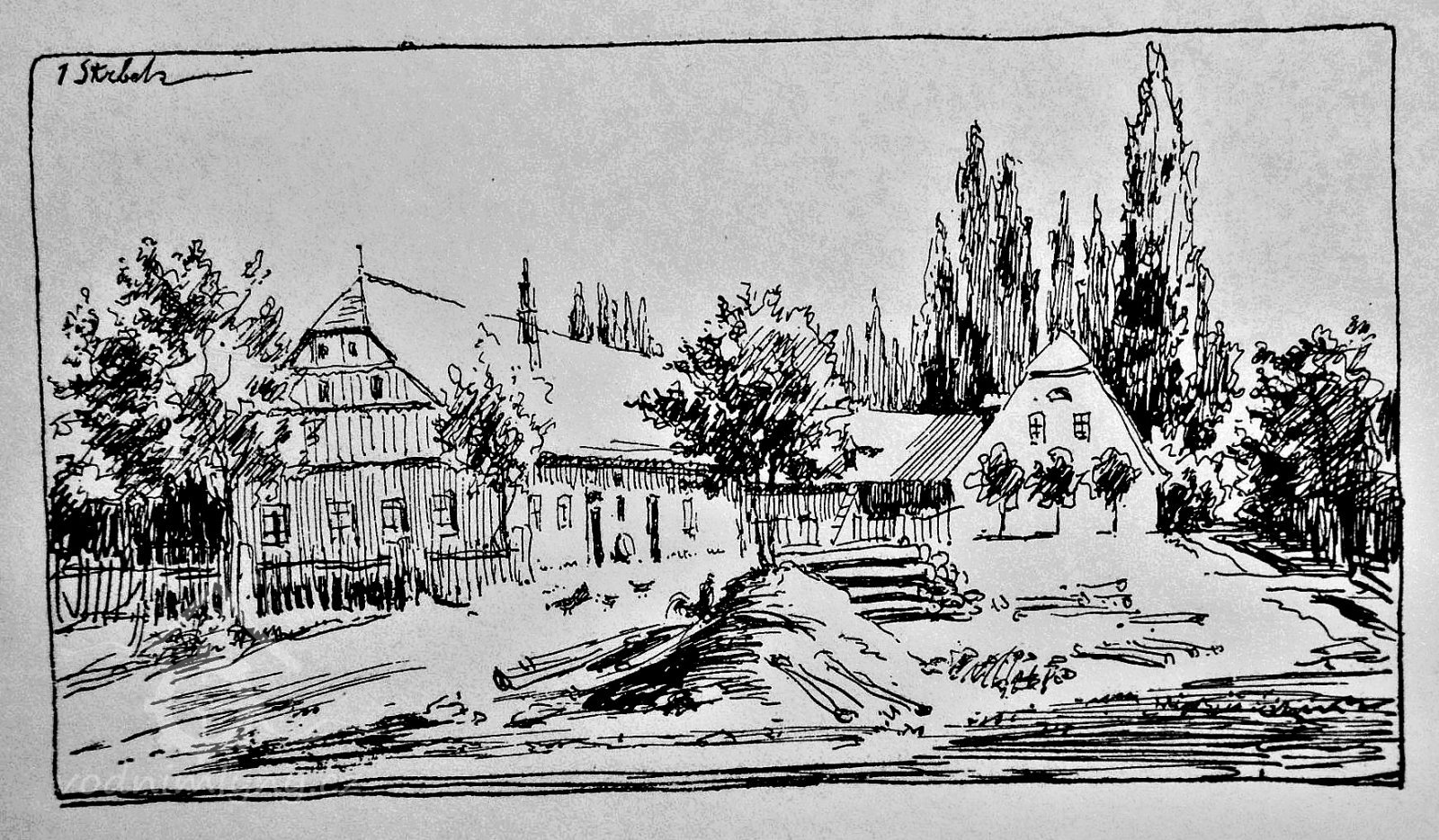 Vedle pily, která byla spojena s mlýnicí, stála v pravém úhlu stodola, naproti pile stáje. Na druhé straně dvora protékala kolem dřevěného domku v olšinách jalová strouha. Hospodářská část byla oddělena od mlýnského dvora plotem. Za stodolou se rozkládal ovocný sad, před okny byla malá zahrádka.