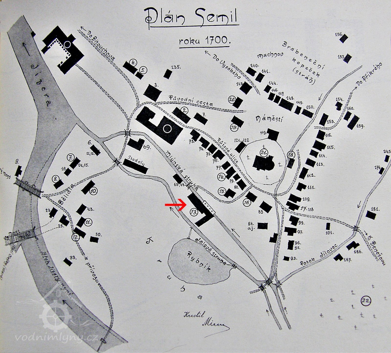 1690 mlýn o 5 složeních s pilou a olejnou emfyteuticky zakoupil Jan Meyvaldt (+1706) i s rybníkem Na Kruhách. Odprodal vrchnosti za 150 kop gr. míš. pozemek na stavbu radnice (1702  postavena dřevěná)