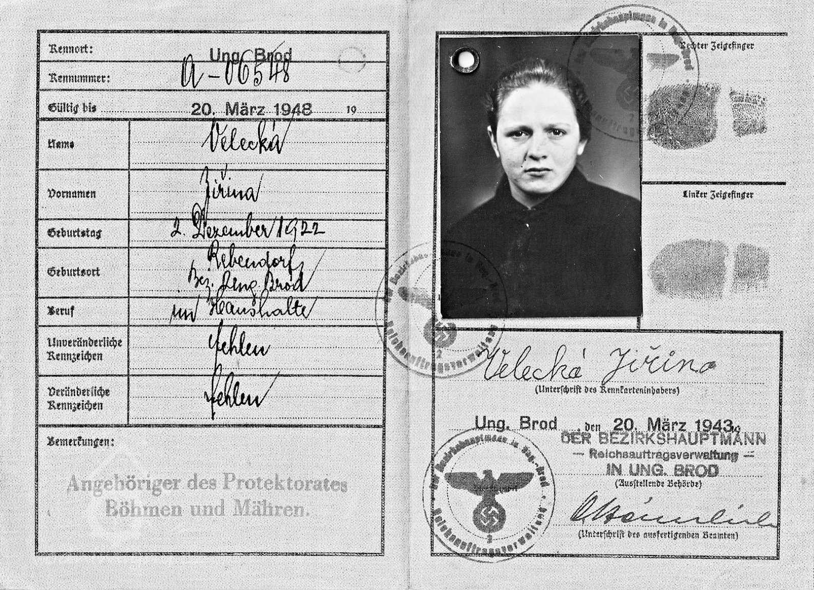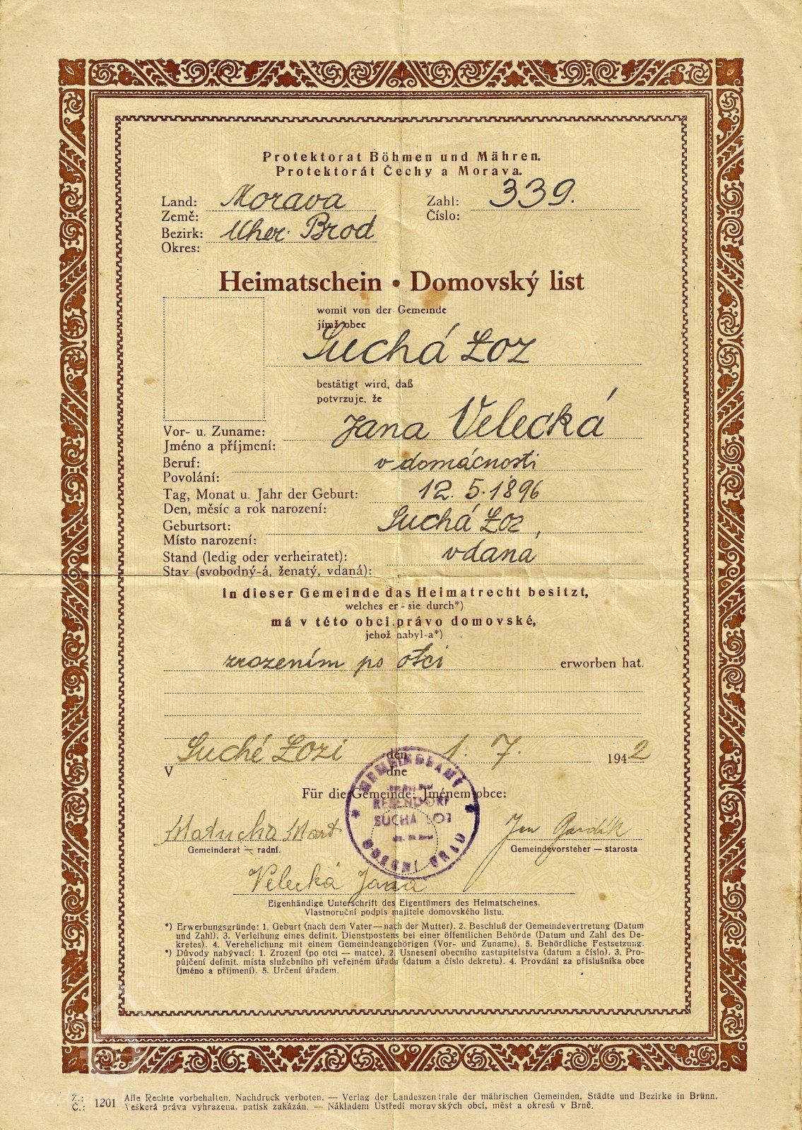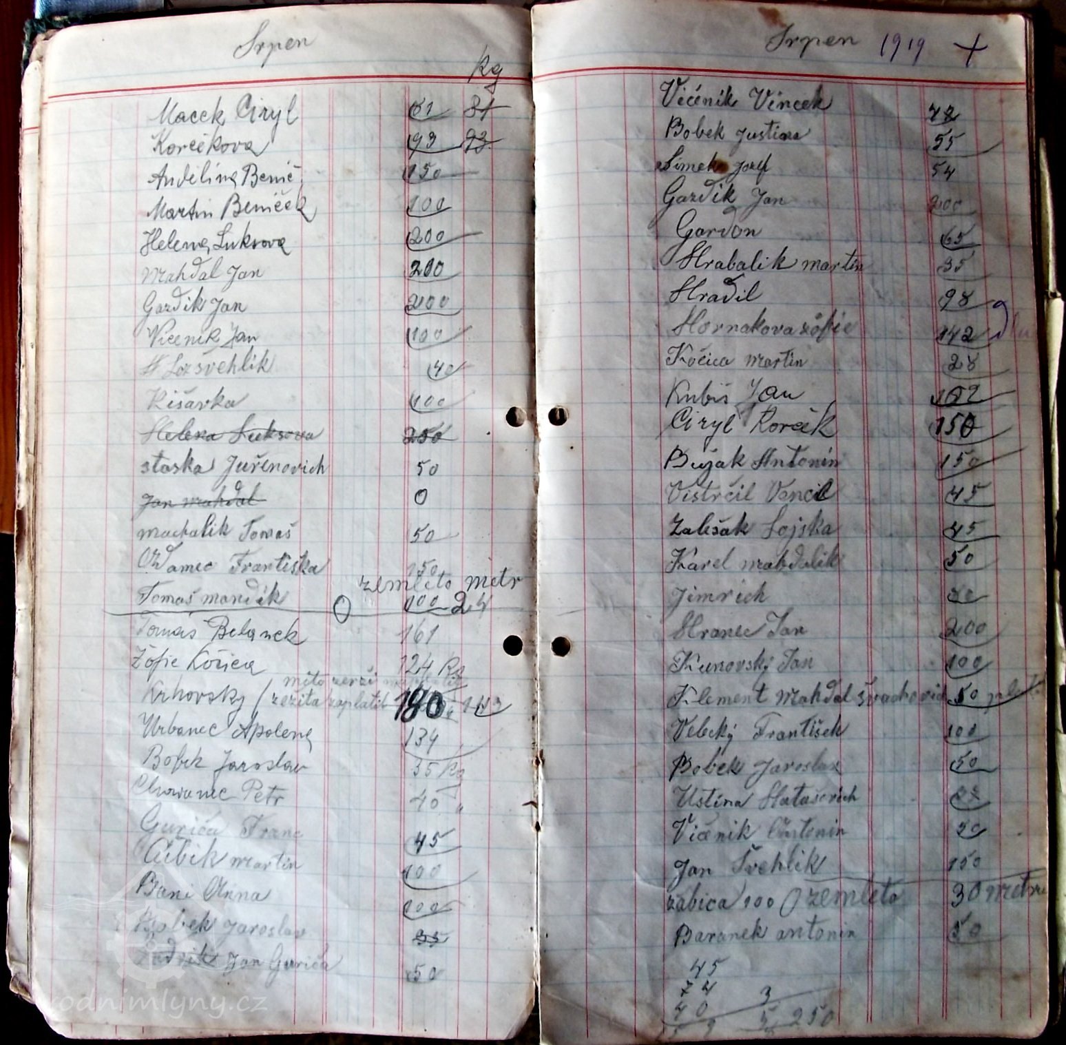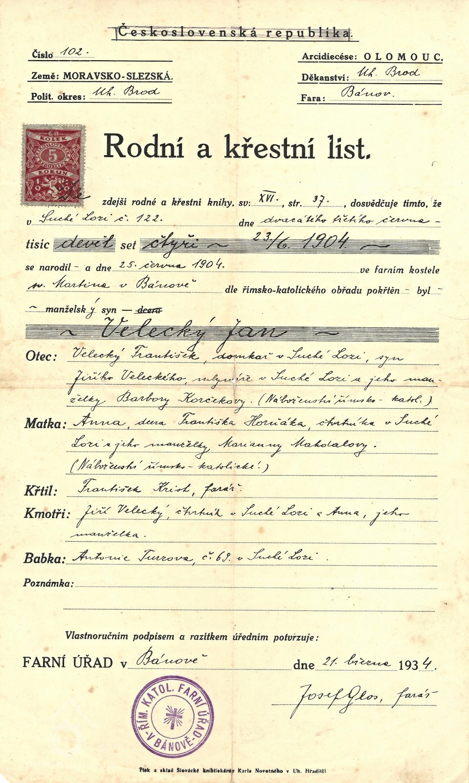 r. 1939 - majiteli mlýna č. 33 manželé Jan Velecký narozen r. 1904 a Johanna Velecká rozená Adamcová narozena r. 1896