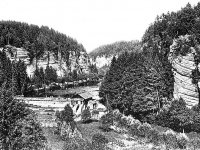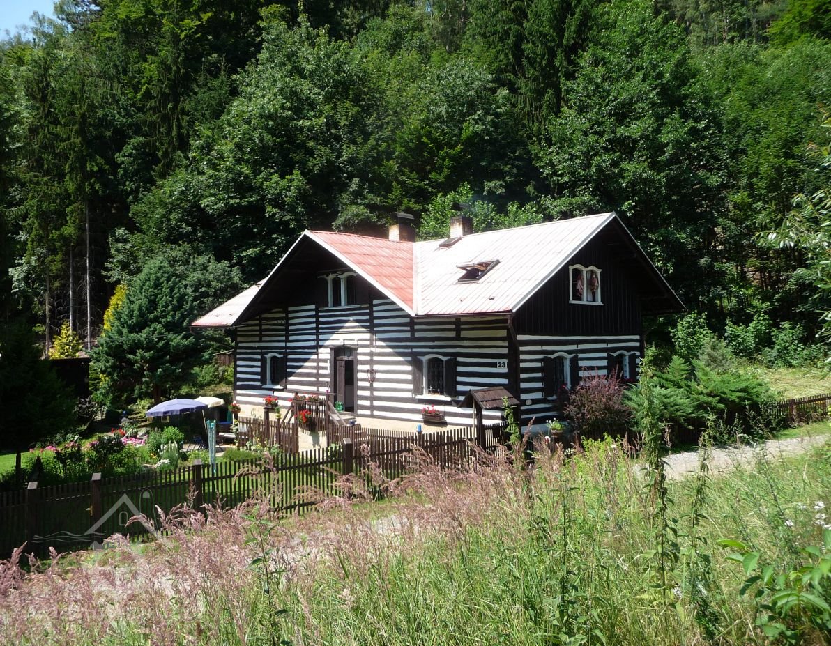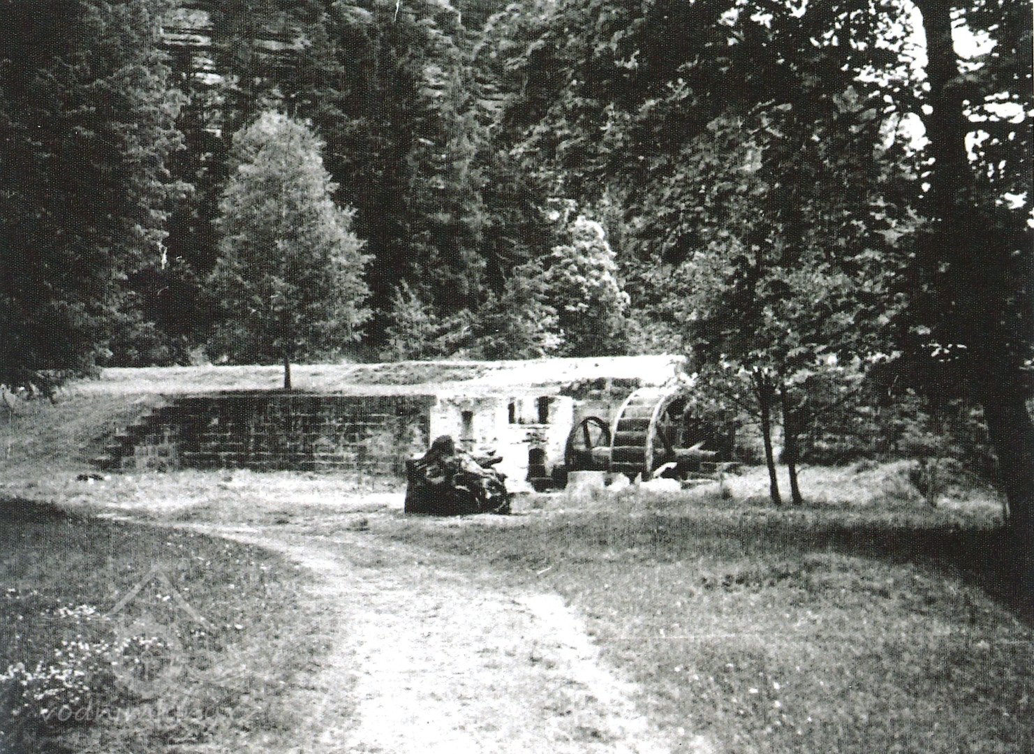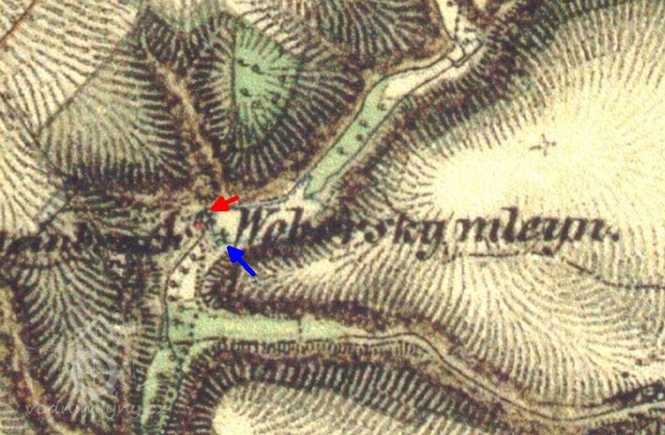 Na levé straně stál roubený mlýn na jehož místě stojí bývalá hájovna, dnes rekreační domek.