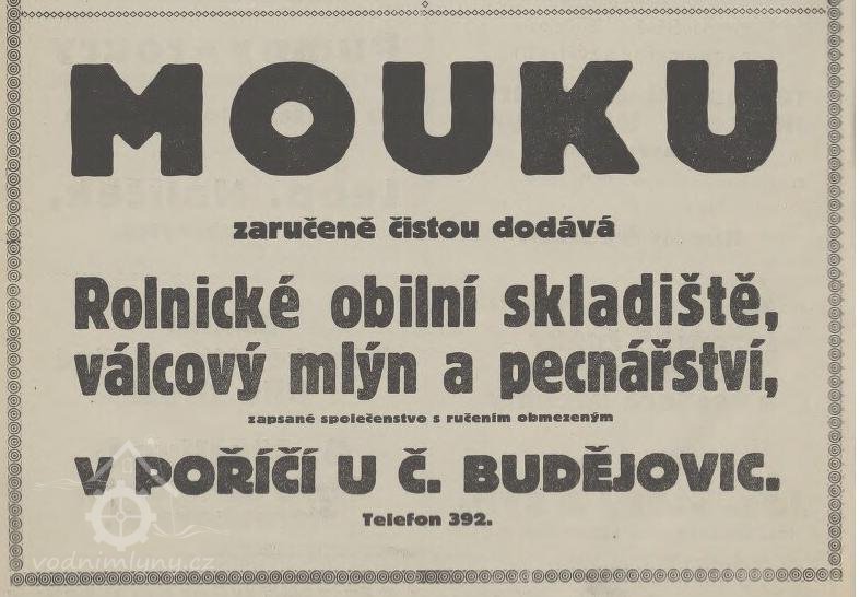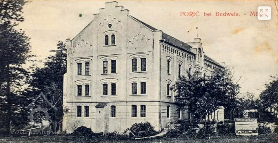 První zmínka o mlynářském cechu a vodním díle v Poříčí se objevuje v kronikách už ve 14. století. Mlýn o jedné budově postavili v roce 1884 budějovičtí pekaři a krupaři. Za první republiky v roce 1936 se dočkal modernizace, stále tam vyráběli mouku výhradně z českého obilí, která si držela výbornou kvalitu.