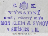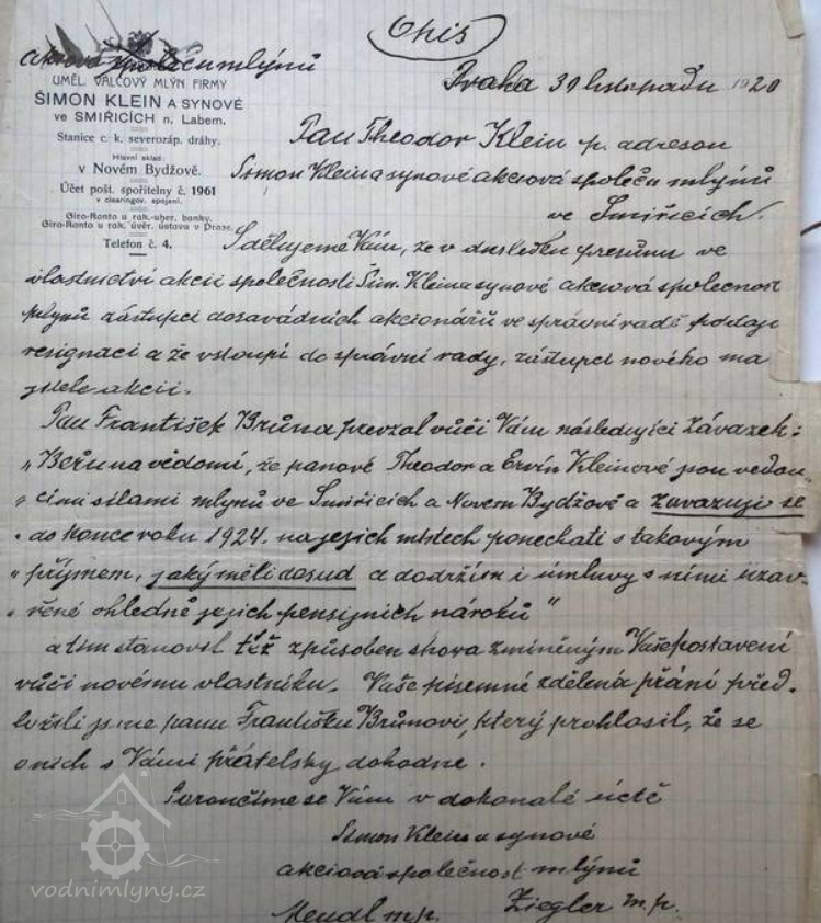 Za vedení p. Šimona Kleina a jeho syna Theodora byl uveden mlýn v rozkvět, na čemž má zásluhy p. Semrád Václav, který v závodě tomto po dobu 43 let jako stárek pracoval.