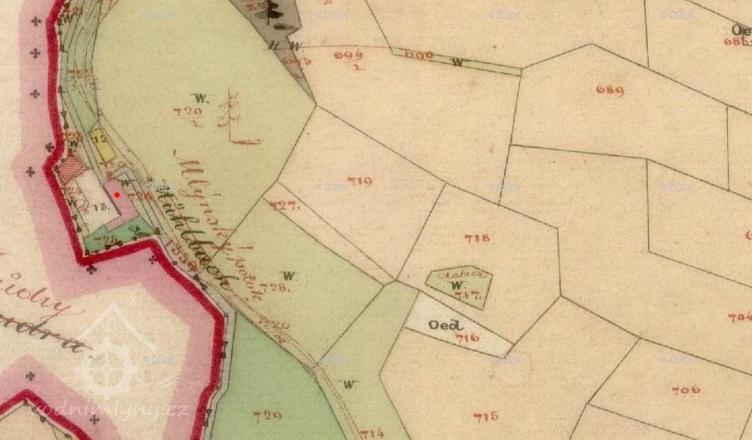 PopisV roce 1930 měl mlýn jedno kolo na svrchní vodu, průtok 0.089 m3/s, spád 4.6 m, výkon 3.5 HP