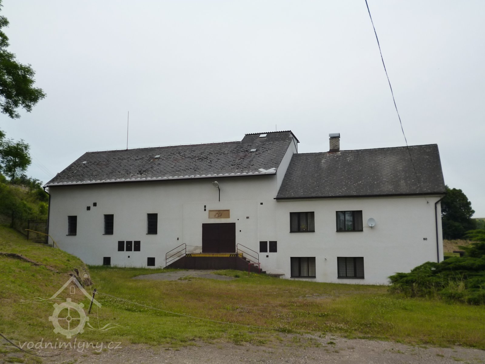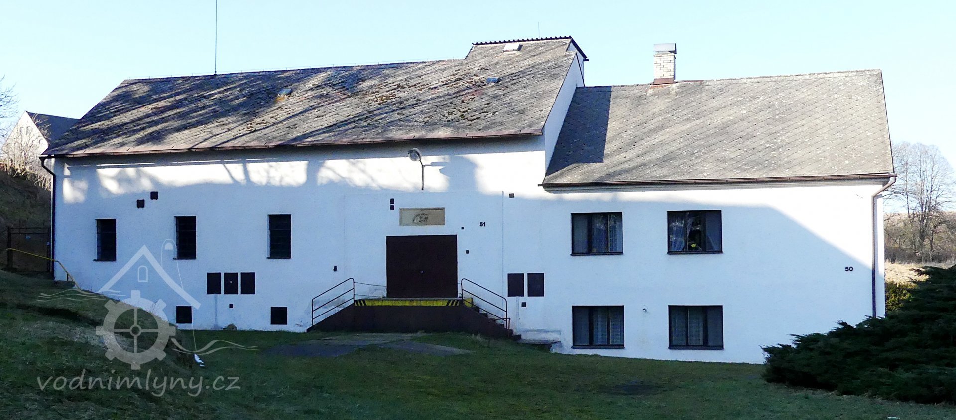 U bývalé mlýnice jsou vrata, vyskladňovací otvor s rampou. Nad mlýnicí je střešní nástavba.
