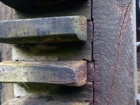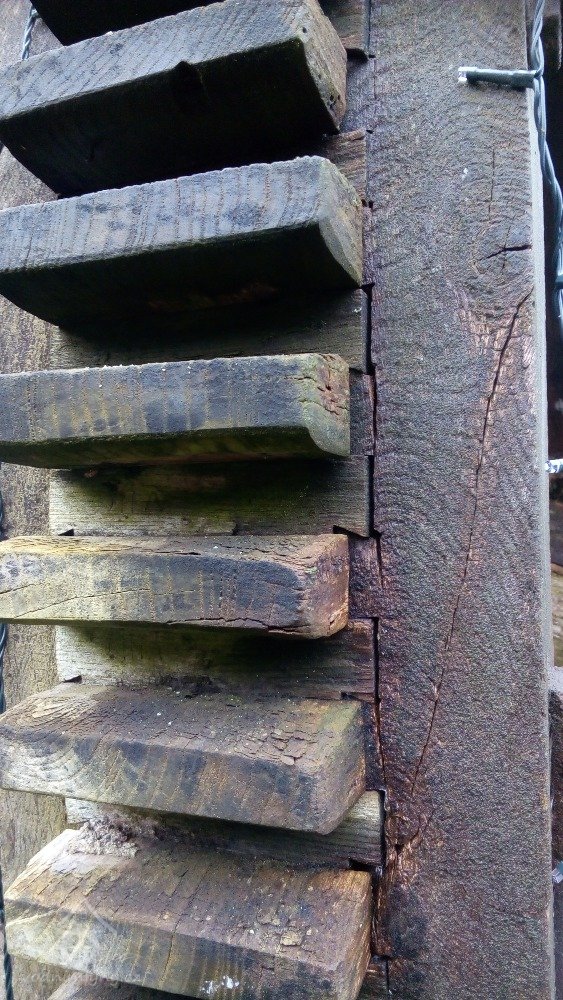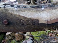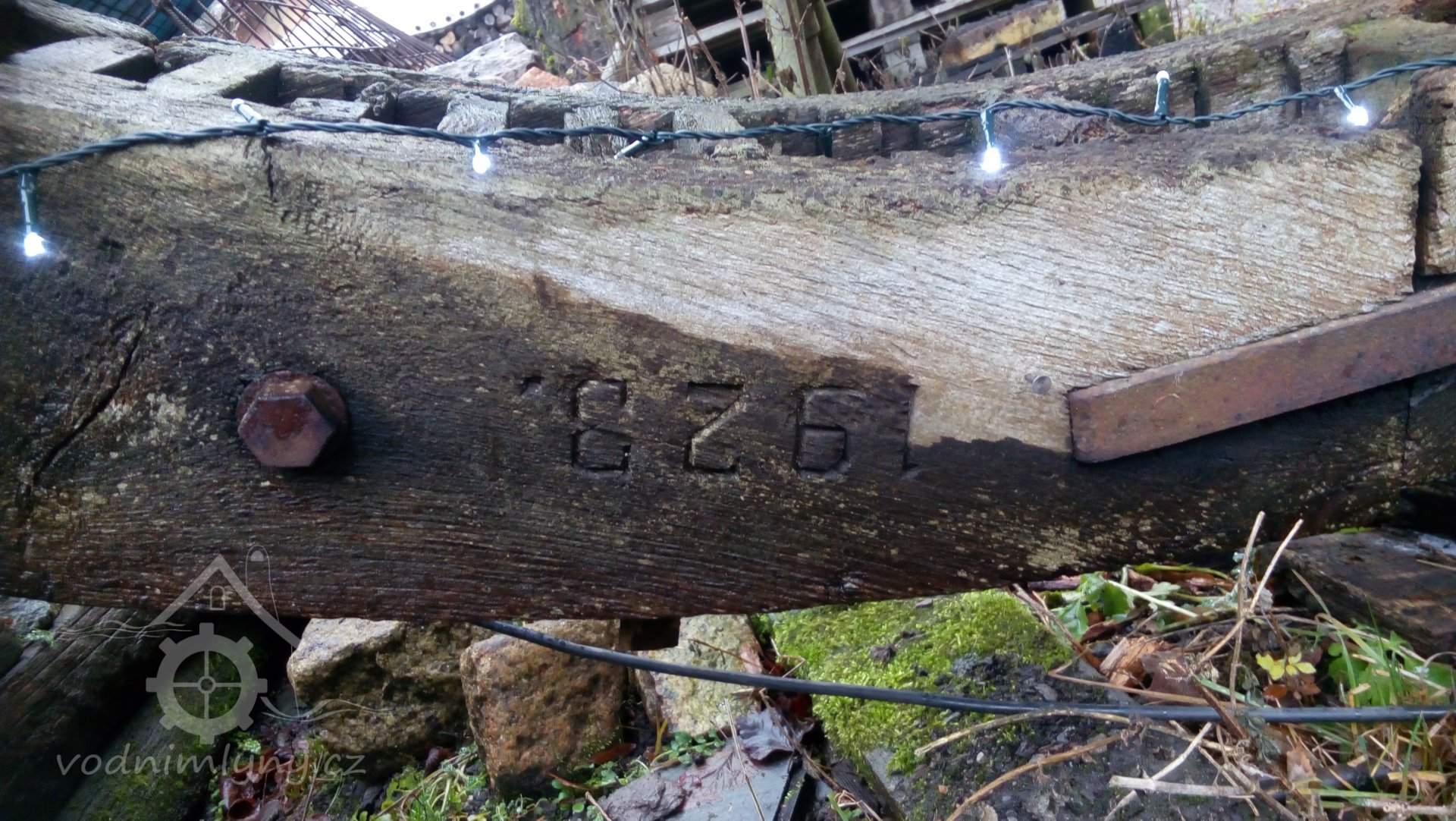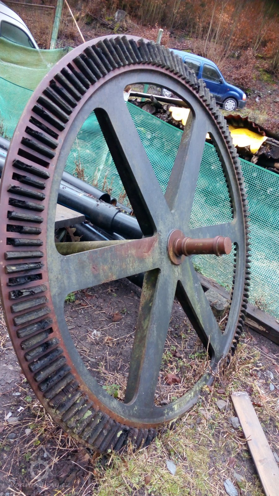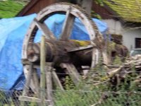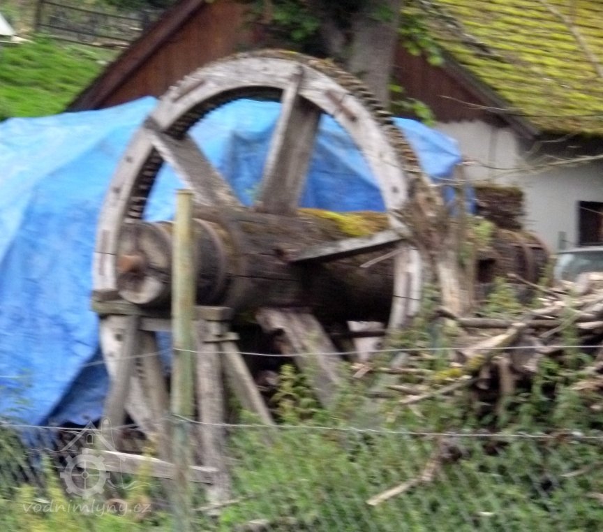 Na dvoře mlýna leží paleční kolo s hřídelí (červenec 2014).