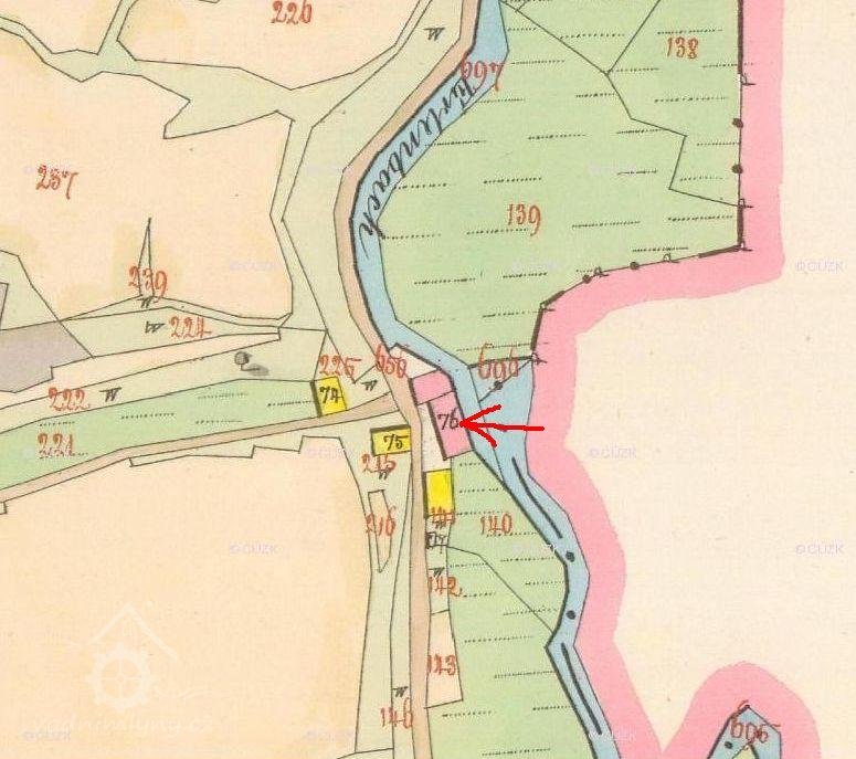Mlýn byl jedním z nejdražších statků ve vsi a jeho majitelé bývali nejbohatšími a nejváženějšími obyvateli obce. Polí a luk u statku v roce 1840 bylo 12,491 hektarů, povětšinou na svazích a stráních v údolí naproti.