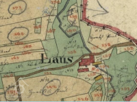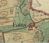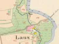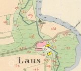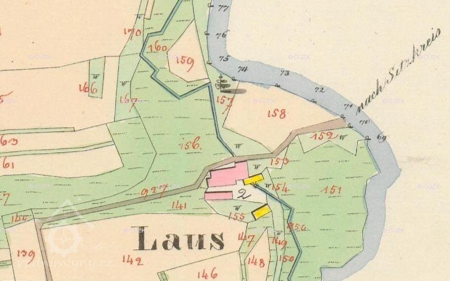 Na otisku je mlýn pojmenován jako "Laus". Cesta od Slavče se zdá dnes probíhá zcela stejně a do pravého úhlu se lomí nedaleko mlýna. Ovšem zdá se, že tehdy pokračovala i směrem na Čížkrajice (nach Sitzkreis). Blíže k potoku vidíme masivní budovu mlýnice a obytnou část, níže přes dvůr je další podlouhlá budova (růžové kamenné-obytné). Na mlýnici doprava navazuje dřevěná konstrukce zřejmě pily (viz. výše) a je zde označeno jedno vodní kolo. Kousek dále jižněji vidíme objekt stodoly (rovnoběžně s pilou, žluté dřevěné-zemědělské). Kolem mlýna vidíme roztroušeny plochy pastvin oddělené potokem i cestou. (W = Weiden). Jinak byly v okolí zřejmě mokřiny, zemědělsky nevyužité v nivě Dluhošťského neboli Klenského potoka.