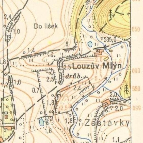 názvy mlýna: 1827 Laus, 1895 Laus M., 1929 Louzův ml., 1952 Louzův mlýn, také jsem našel Herbstův, Hruškův