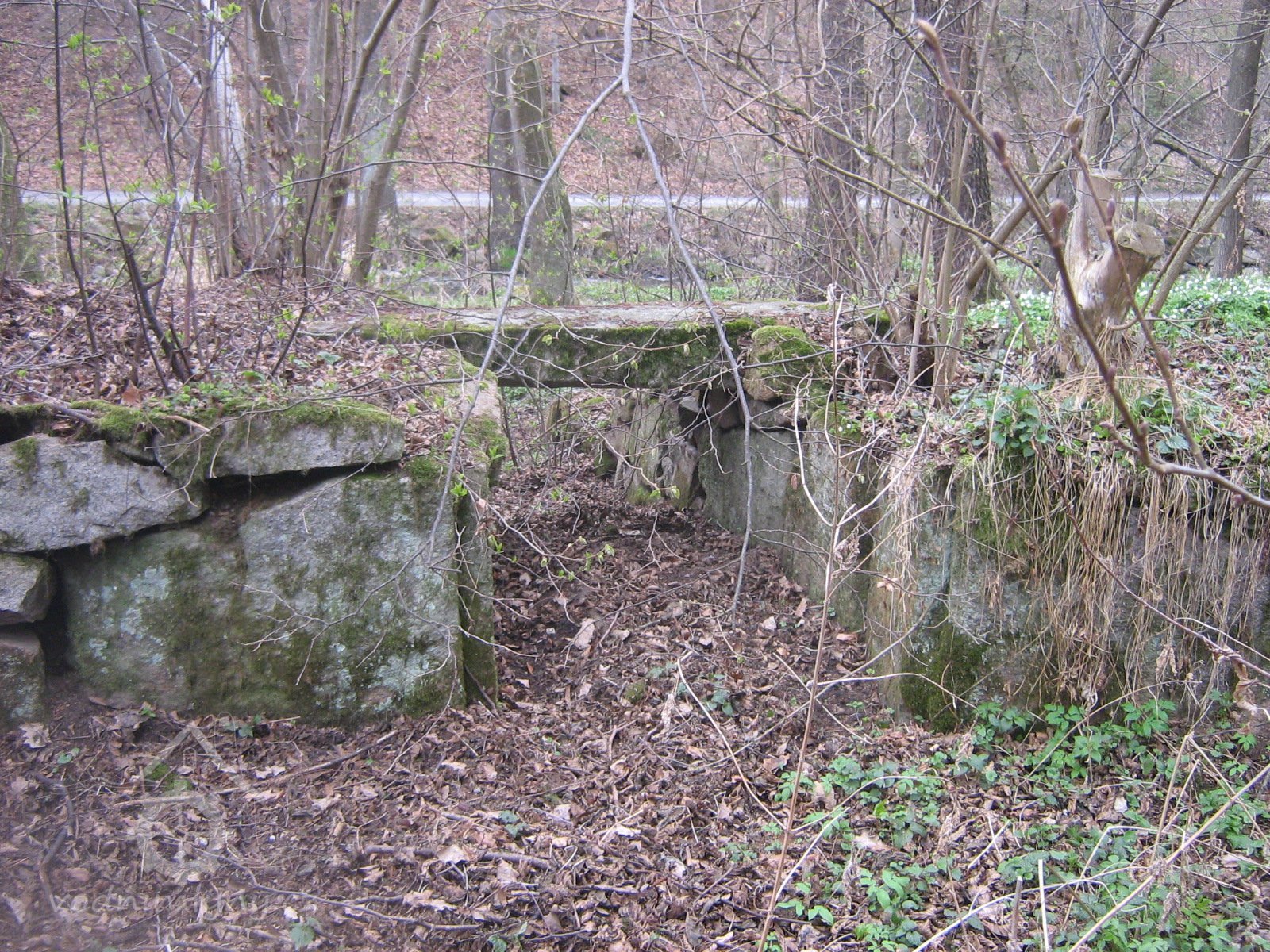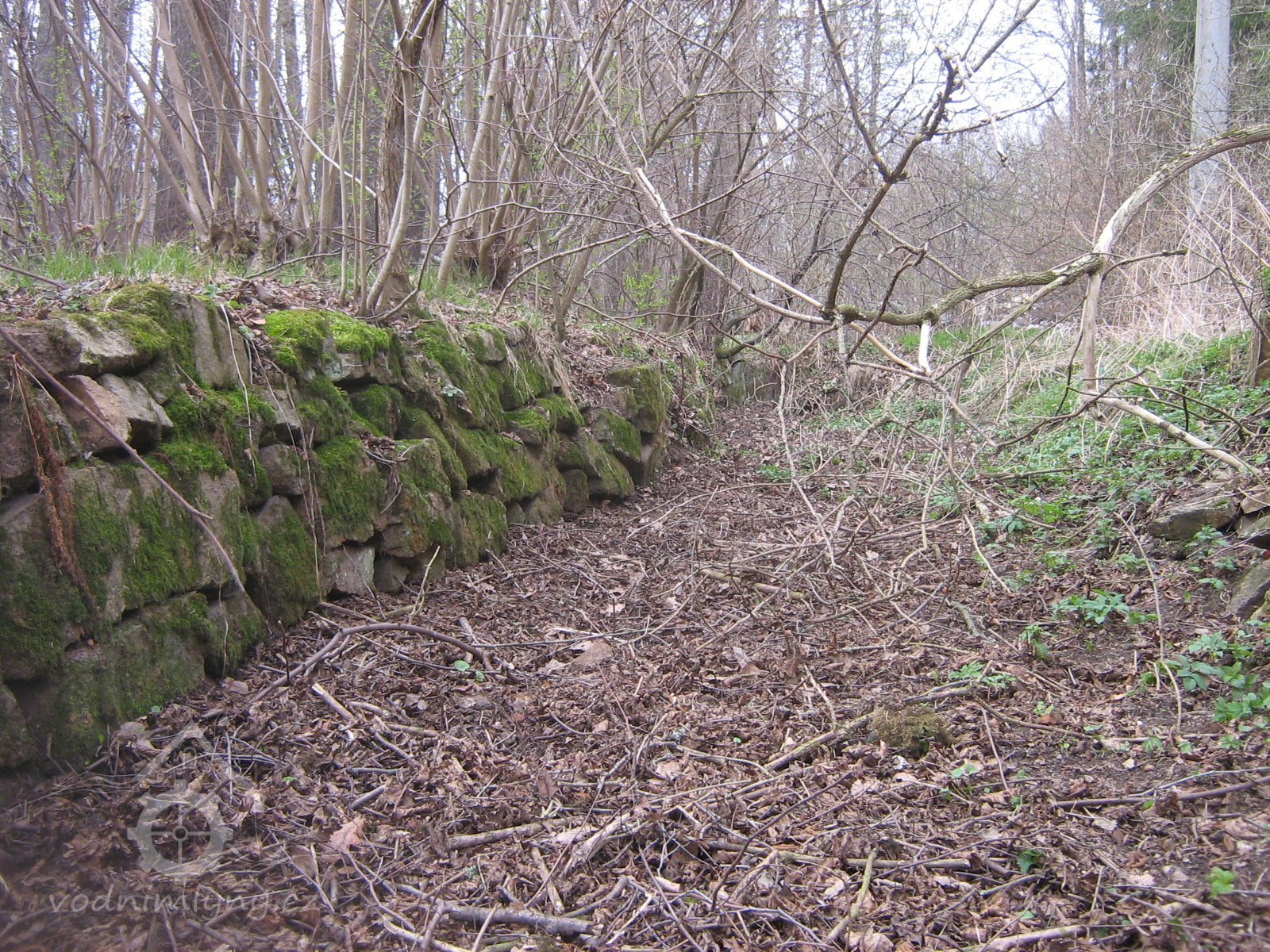 Opět zde vidíme solidní vyztužení stěn náhonu kameny, po několika metrech narazíme na můstek z vlnitého plechu, který zřejmě nahradil dřívější kamenný. Před můstkem vidíme masivně stavěnou srážku ze skládaných kamenů s kamenným překladem, koryto potoka je jen pár metrů vlevo. O kus dále narazíme na velmi pěkný kamenný můstek složený ze dvou překladů. Poté se náhon značně rozšiřuje a zdá se že zde tvořil jakýsi pseudoretenční rybník. Dále se však náhon opět zužuje kamennou zídkou. Po chvíli se dostáváme přímo k budově mlýna a mlýnici.
