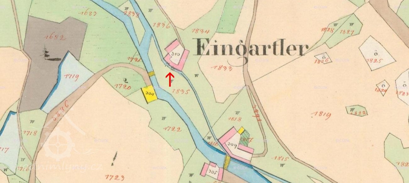 1930 - č. 195, Josef Šimeček, mlýn, 1 kolo na svrchní vodu, průtok 0,12 m3/s, spád 4m, výkon 4,1 HP (Seznam vodních děl 1930)