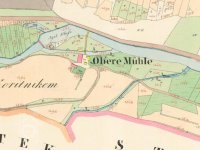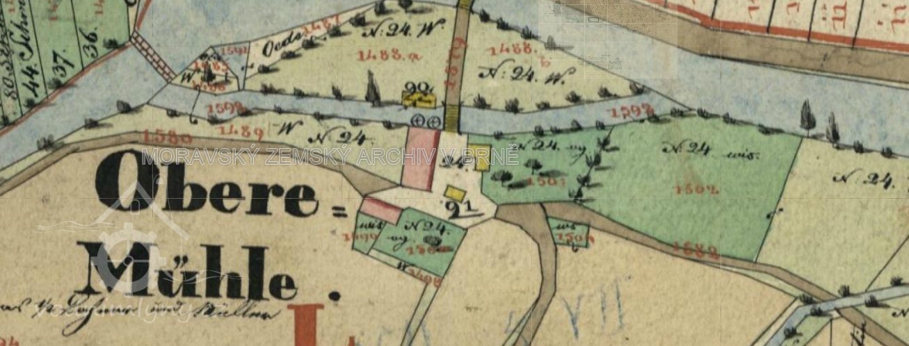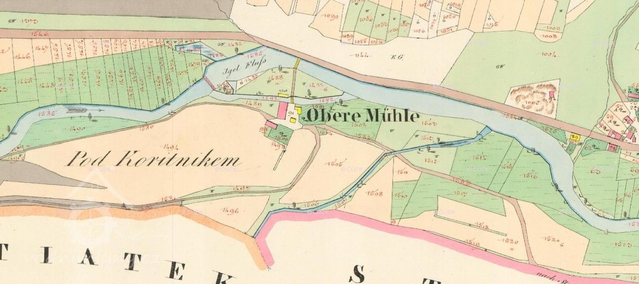 Mlýn a pila na řece Jihlavě při hlavním silničním tahu z Třebíče na Náměšť nad Oslavou.