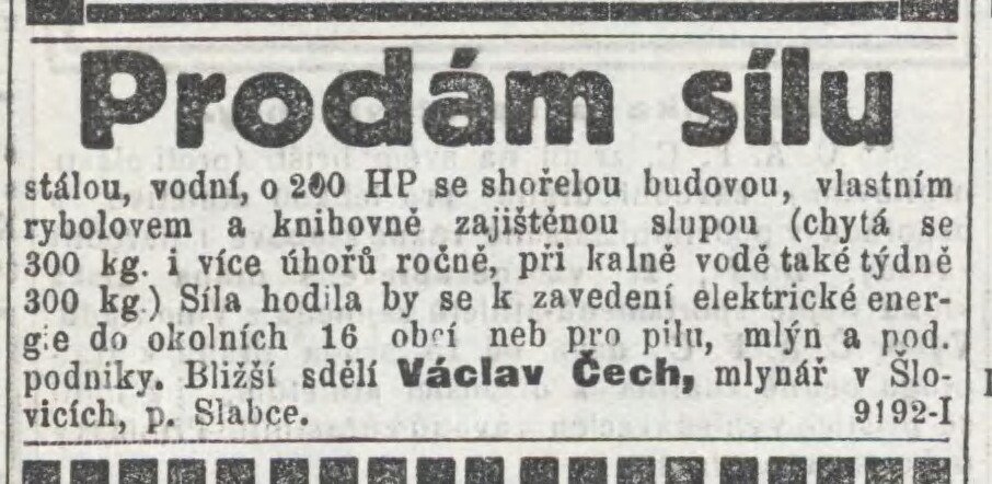 Název archiváliemlýn Václava Čecha ve Slabcích, Družstvo pro rozvod el. energie ve Slabcích (spisy a plány z let 1911–1929)
