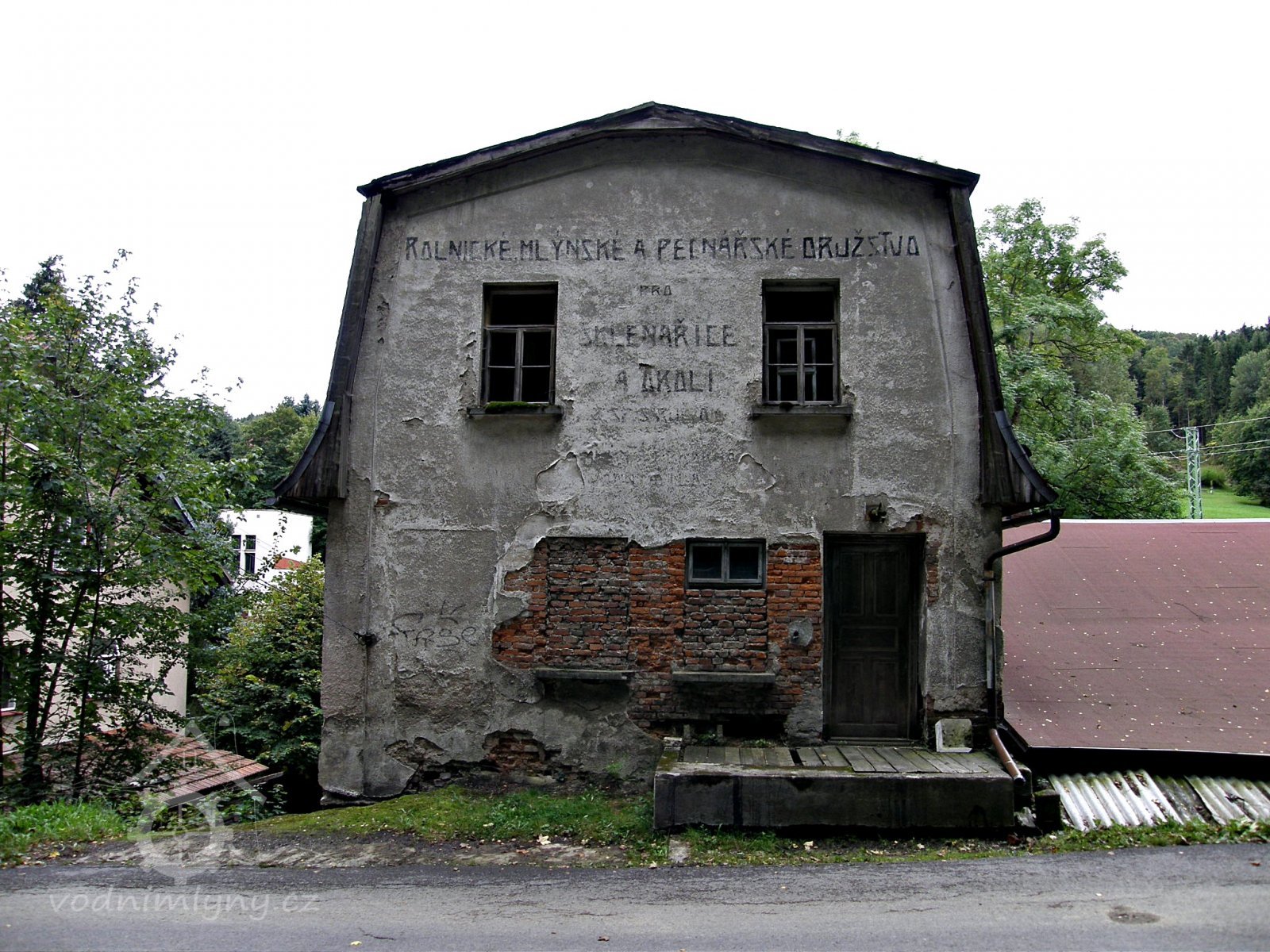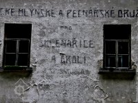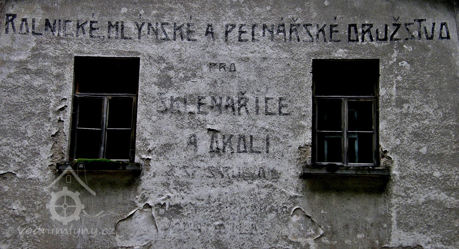 dochovaný nápis na omítce: „Rolnické mlýnské a pecnářské družstvo pro Sklenařice a okolí.“