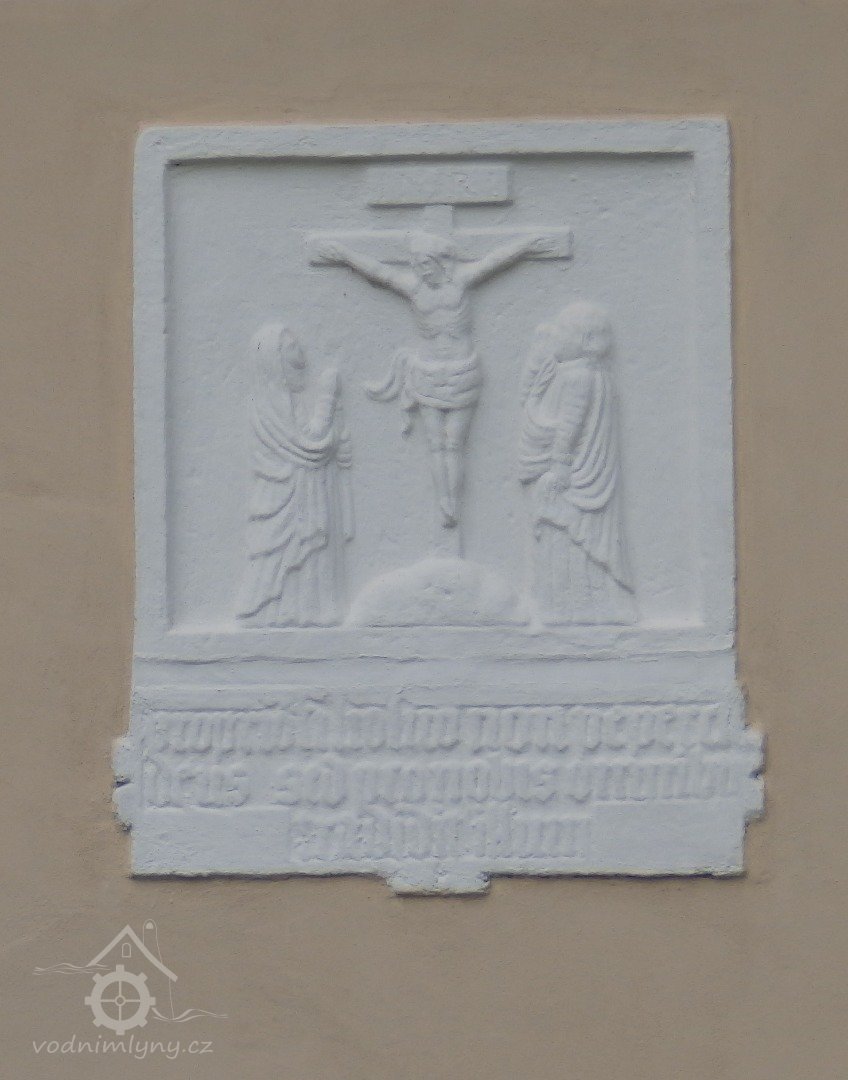 Mezi druhým a třetím oknem je na kameni vytesáno umučení Páně.