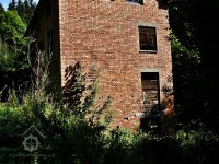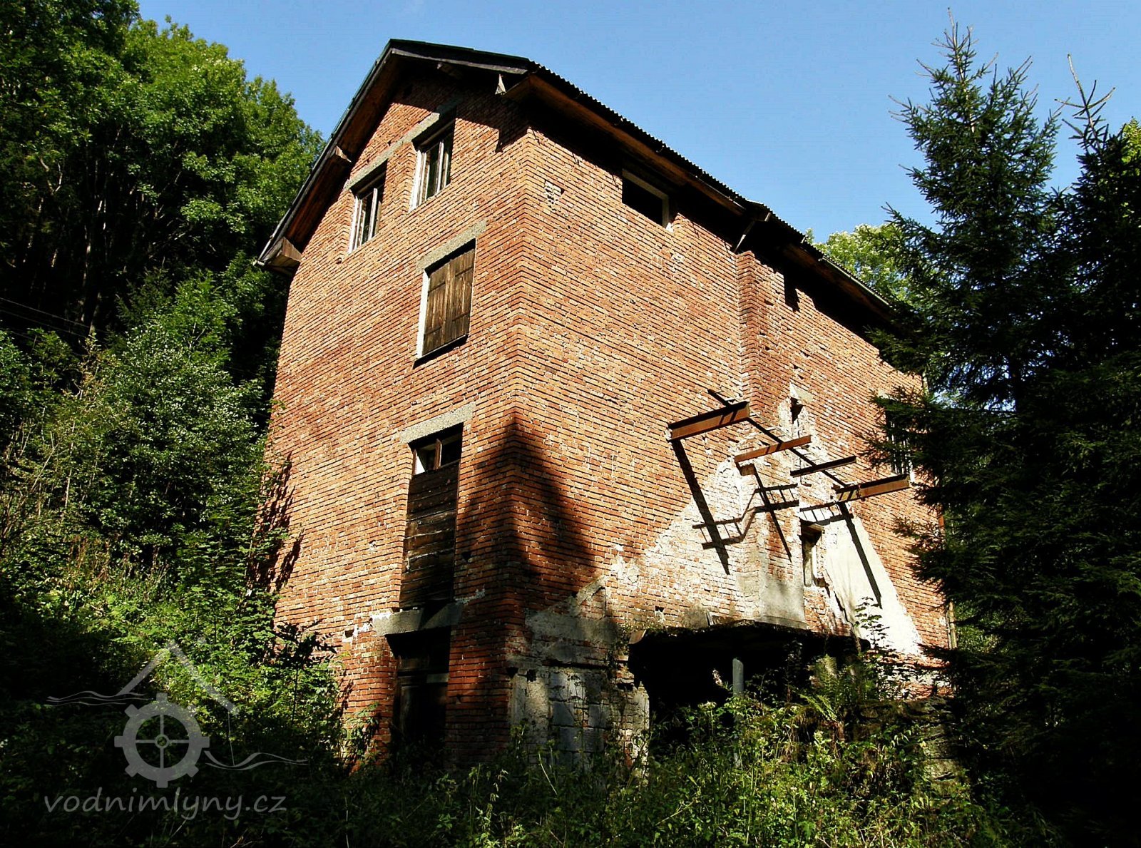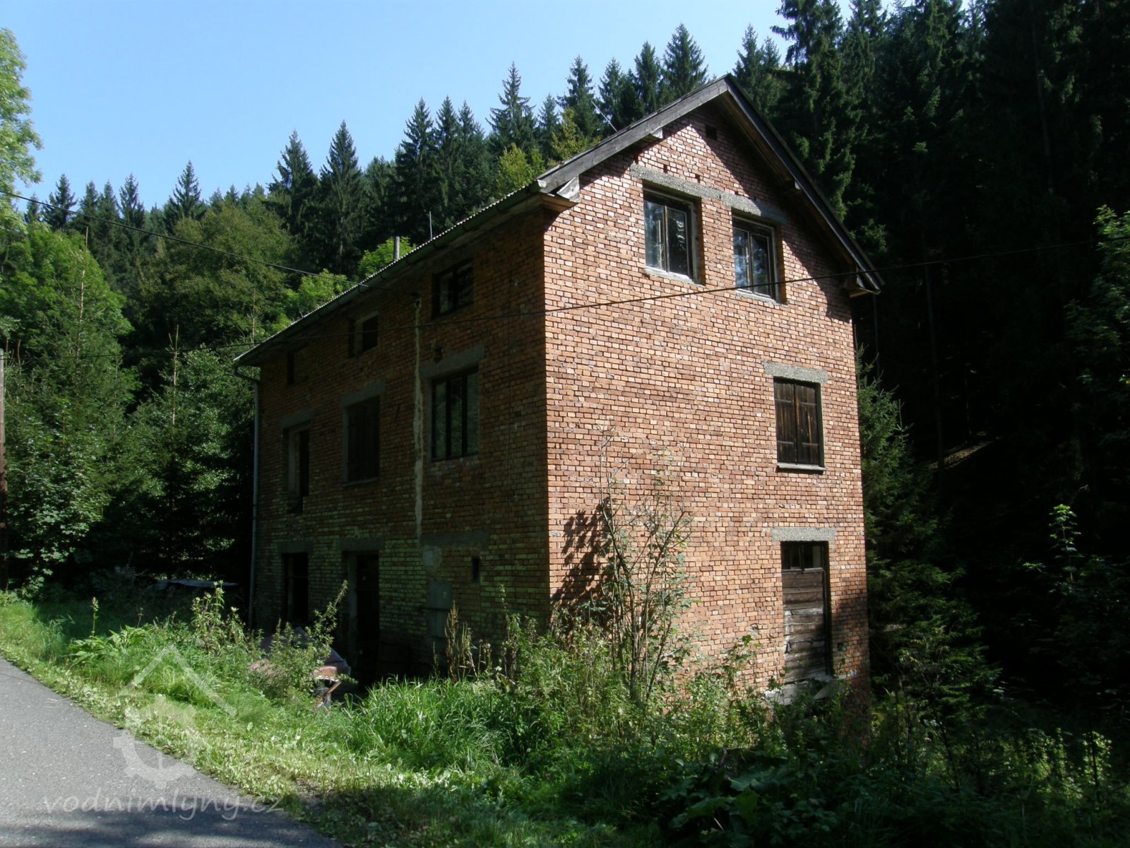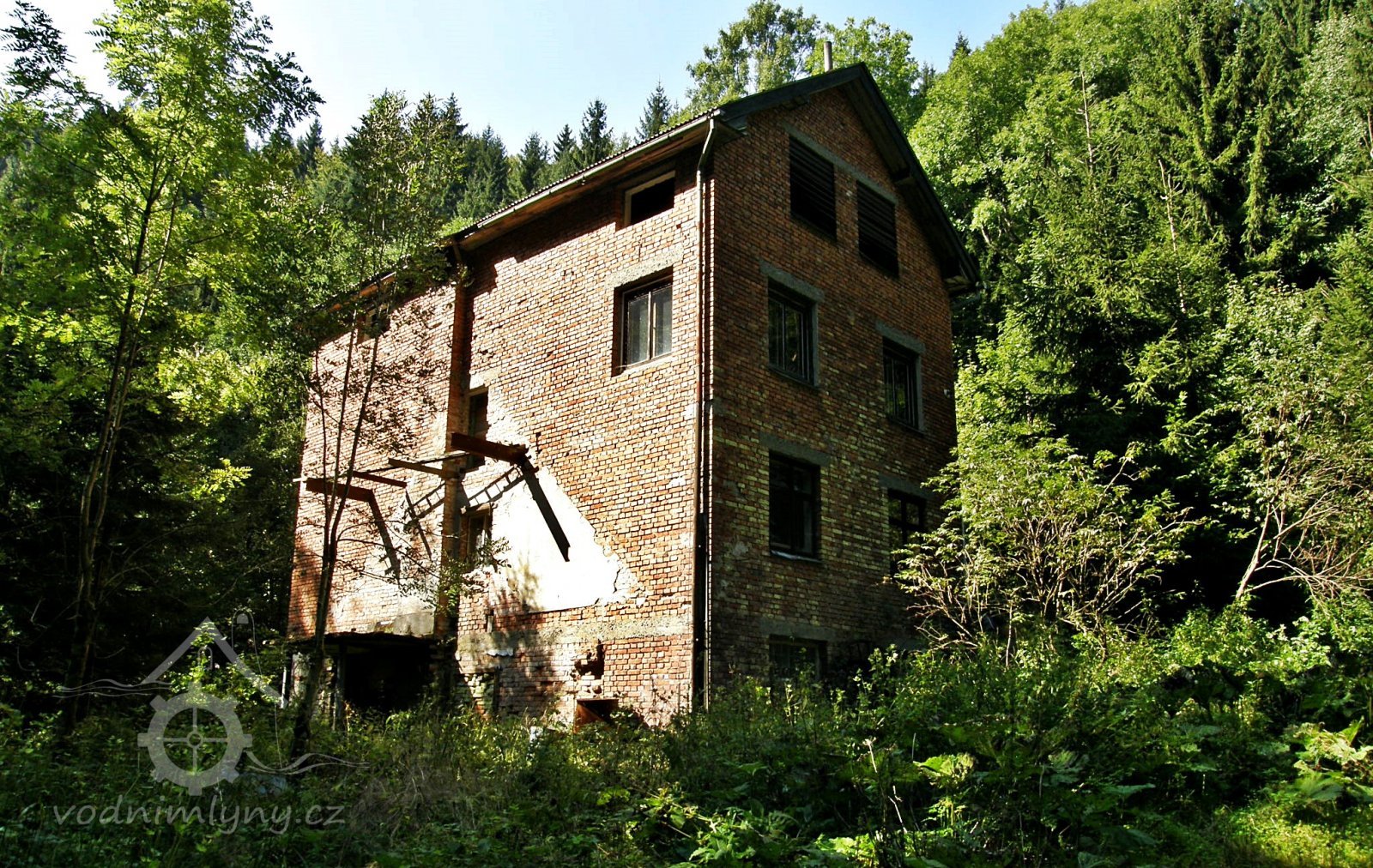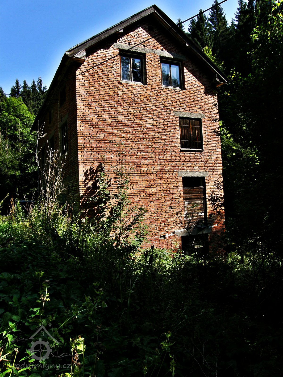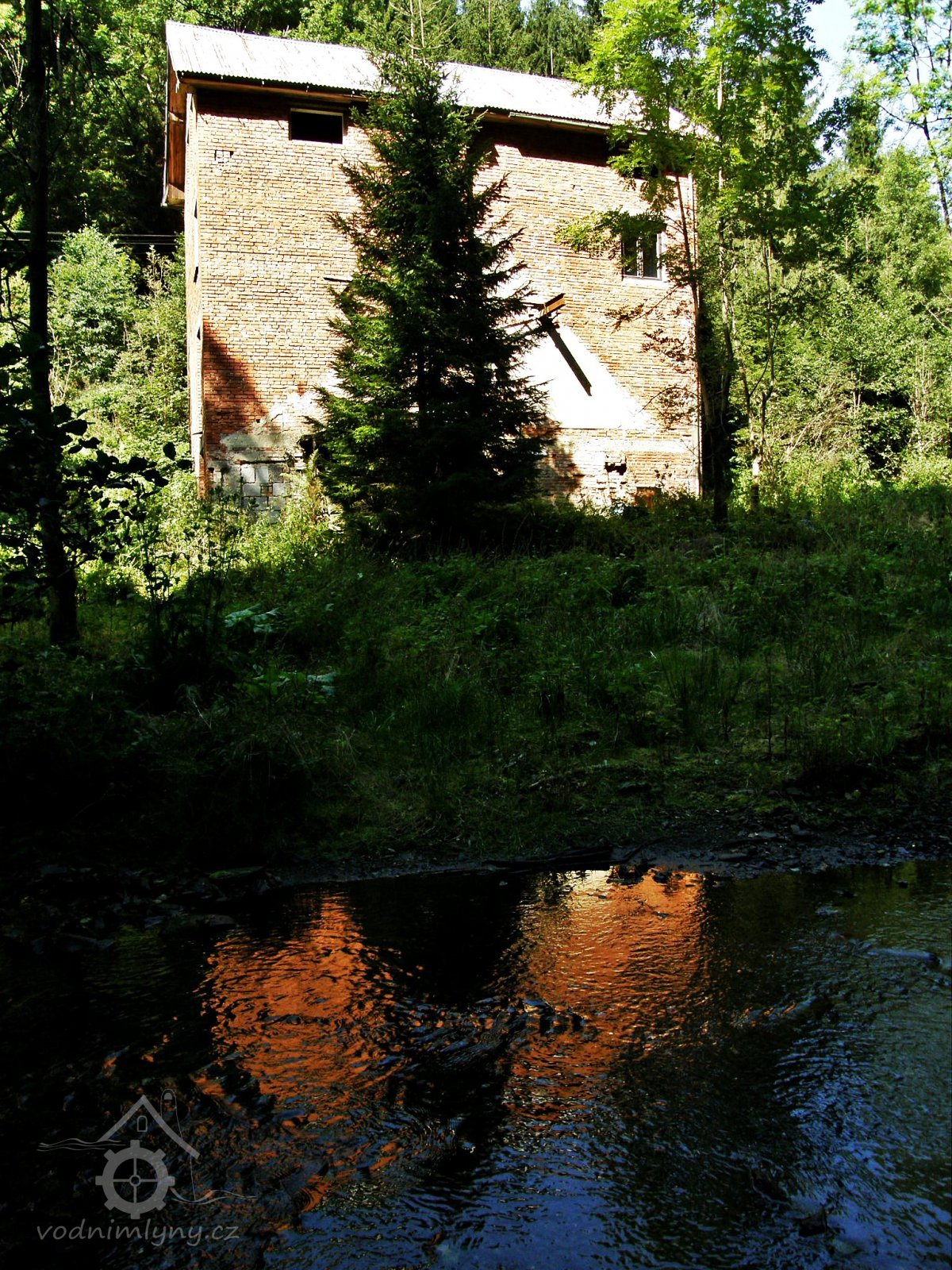 Vysoká patrová cihlová budova mlýna ve stinném údolí Vejpalického potoka.