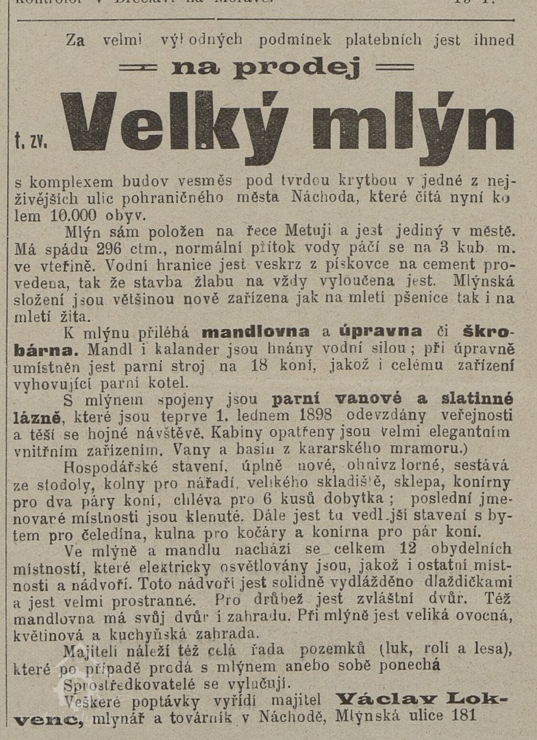 Velký, původně panský mlýn stál na rozcestí dnešní Mlýnské a Palachovy ul. První pís. zmínka r.1501. Byl poháněn vodou z Metuje,která v minulosti meandrovala až k žel. trati. R. 1880 fy Lederer a Stránský přestavěla část mlýna na mechanickou tkalcovnu. S rozvojem elektrifikace r. 1905 zakoupilo mlýn od mlynáře Václava Lokvence město Náchod a přestavělo na měst. elektrárnu. Byla instalována turbína o výkonu 70 HP a rezervní parní stroj. R.1948 převedena elektrárna pod VČE. Po zboření domu v 80. letech zde postaven panelový dům.