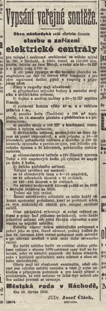 S rozvojem elektrifikace roku 1905 celý objekt zakoupilo město Náchod od mlynáře Václava Lokvence, aby zde přestavbou dalo do provozu městskou elektrárnu. Byla zde instalována turbína o výkonu 70 HP a rezervně parní stroj o výkonu 120 HP. S postupující elektrifikací pak byly místní zdroje el. proudu rušeny a energii dodávaly Východočeské energetické závody.