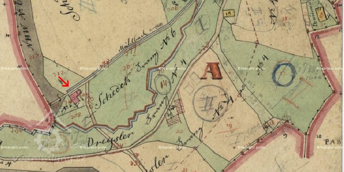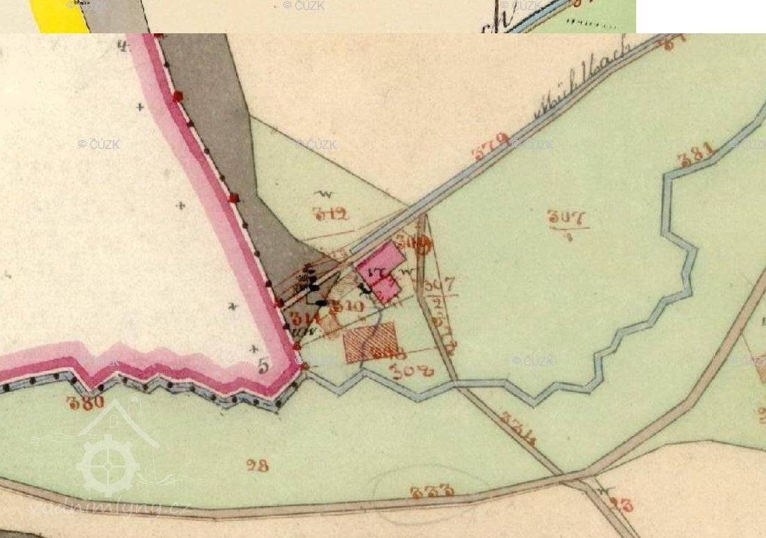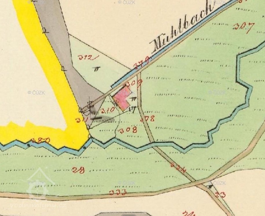 PopisV r. 1930 zde byla 2 kola na svrchní vodu, průtok 0,06 m3/s, spád 5,6 m, výkon 3 k (RR).
