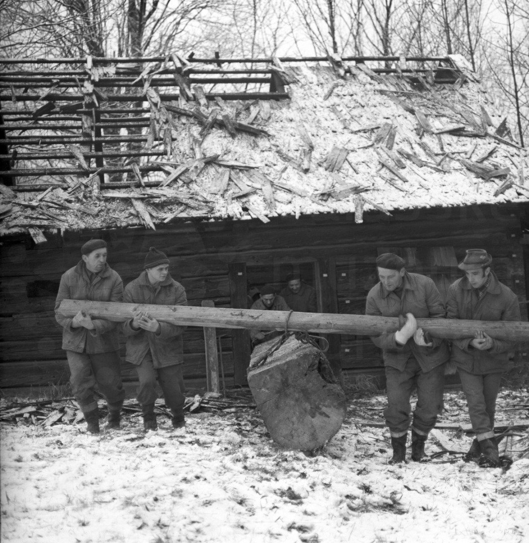Stavba mlýna na novém místě - vantroky, lamfešty, 1982, © www.nmvp.cz/roznov