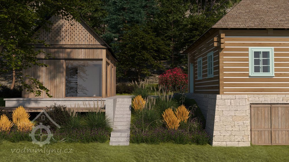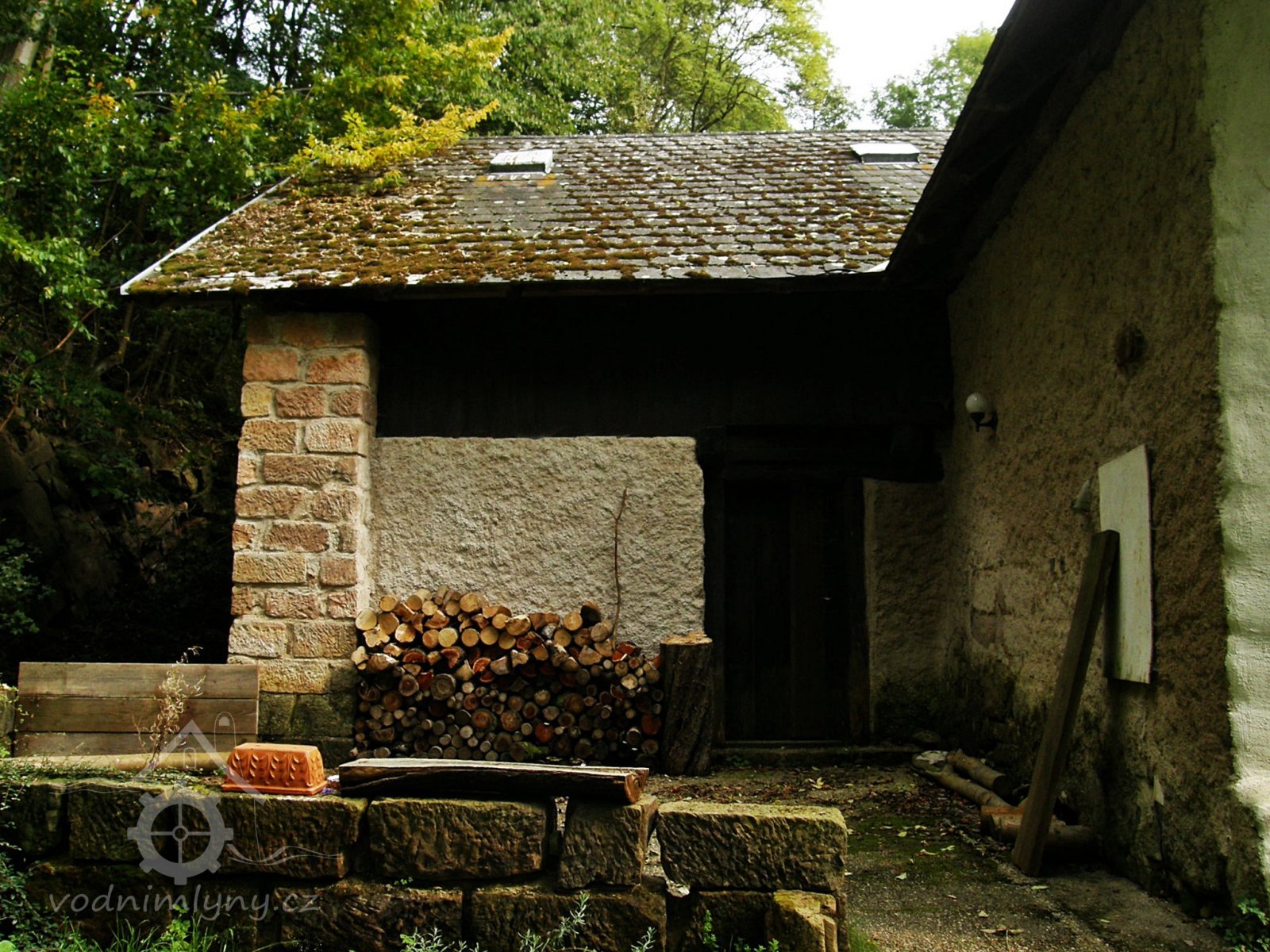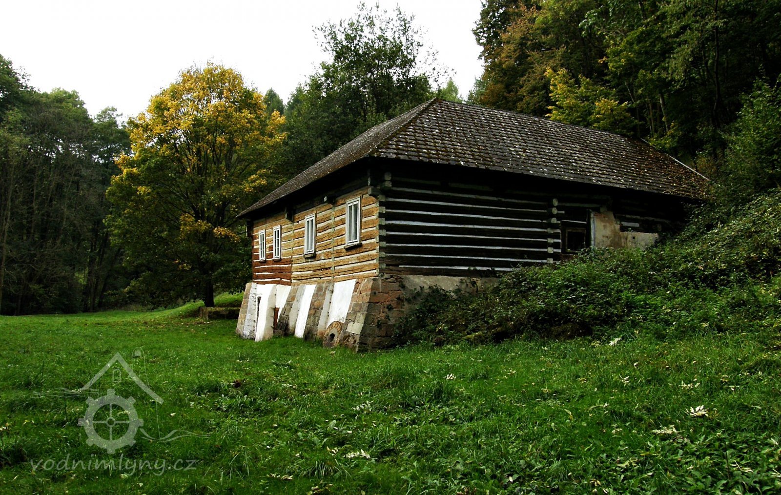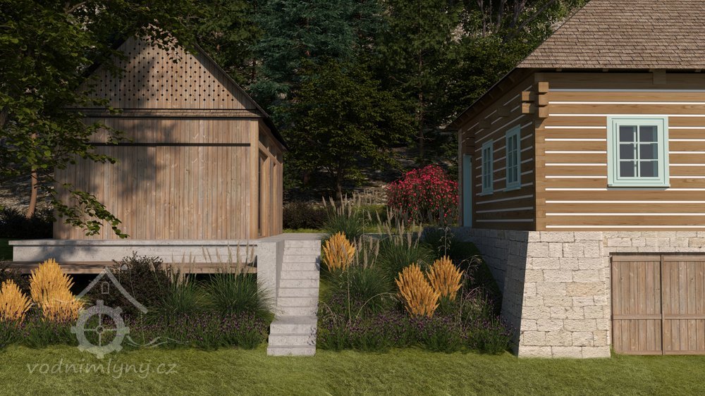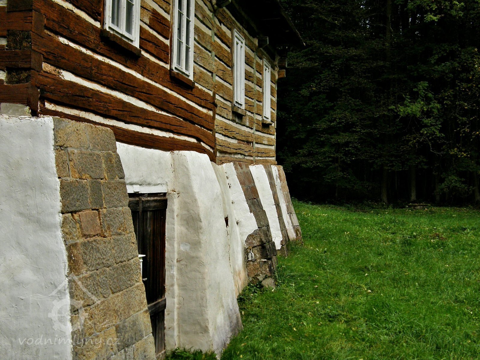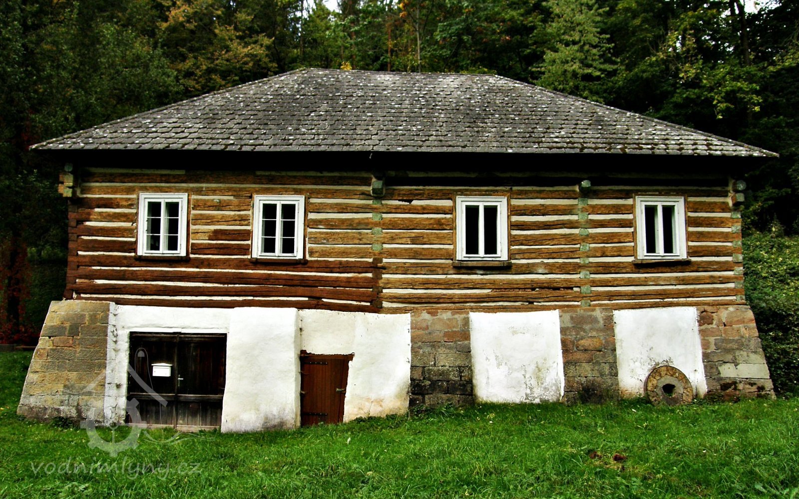Vodní mlýn s roubeným patrem nastavěným na zděnou substrukci. Příklad venkovské technické stavby spojující pod jednou střechou provozní i obytné prostory.