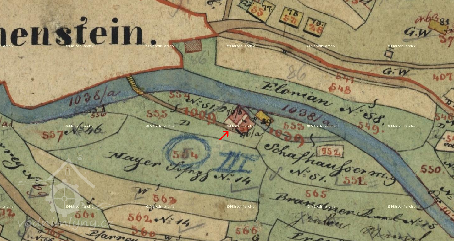 -dům čp.51/st.p.76/1 a čp.76/st.p.76/2 a dále pila k čp.51/ st.p.76/3 a hospodářská budova /stodola a stáj/ na st.p.120- stála západně od výše uvedených staveb.Podle knihy "Im Lande der Künische Freibauern"byl původní název mlýna "Gmoa Mühle".Jméno Schafhauser se objevuje již v době vzniku mapy Stabilního katastru/1837/.