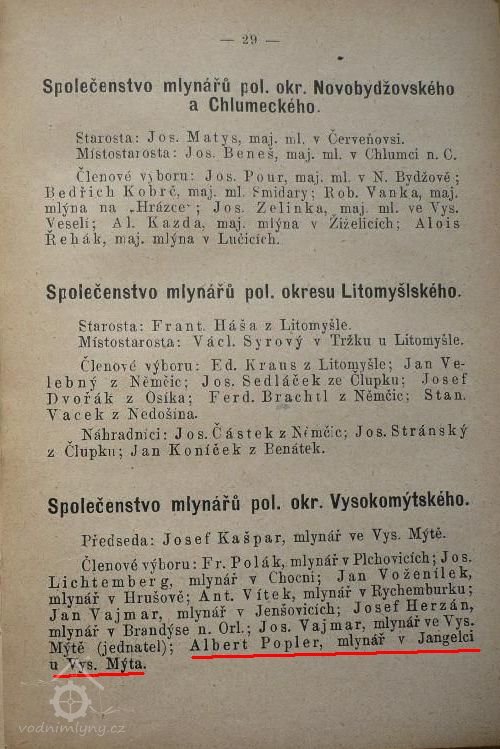 1899 - Albert Popler členem výboru Společenskva mlynářů pol. okr. Vysokomýtského (Fr. Dušk, Kapesní kalendář mlýnů česko-moravských, r. 1899) (HŠ)